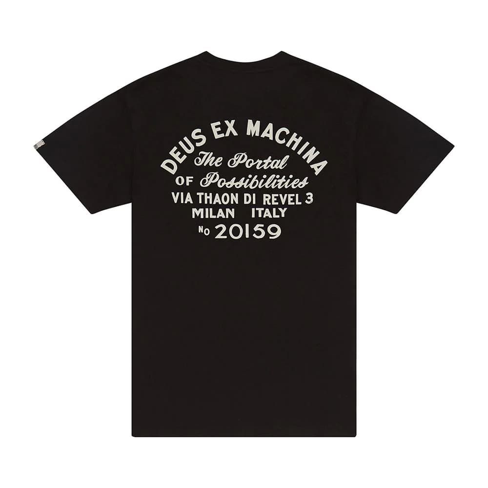 Esta camiseta de ajuste regular cuenta con cuello redondo, manga corta, bolsillo en el pecho, el logo de Deus Ex Machina estampado encima del bolsillo y la dirección de la tienda Deus en Milán serigrafiada en la espalda.