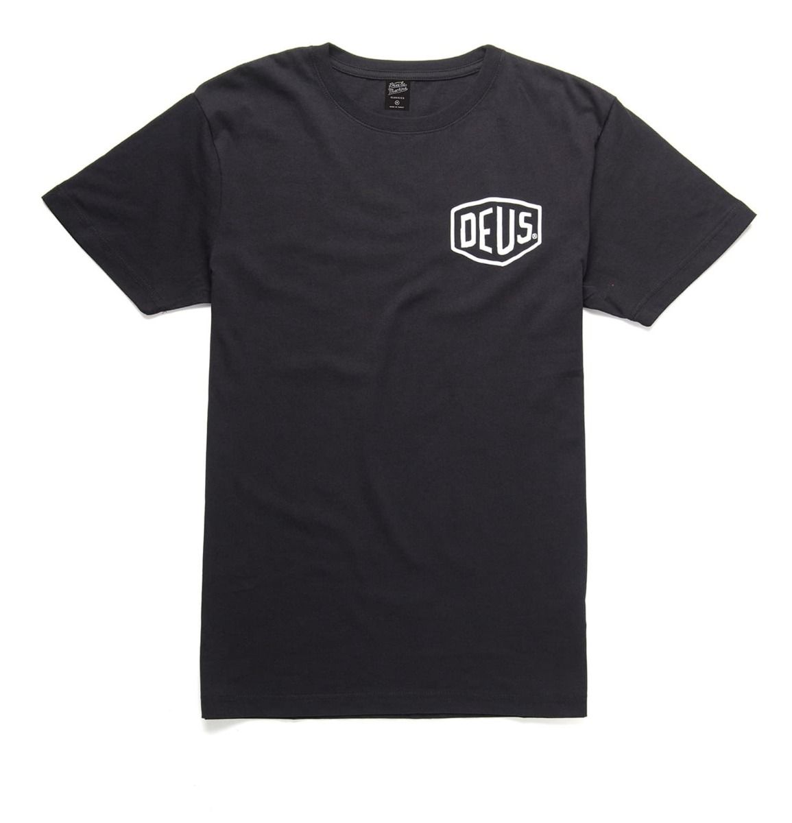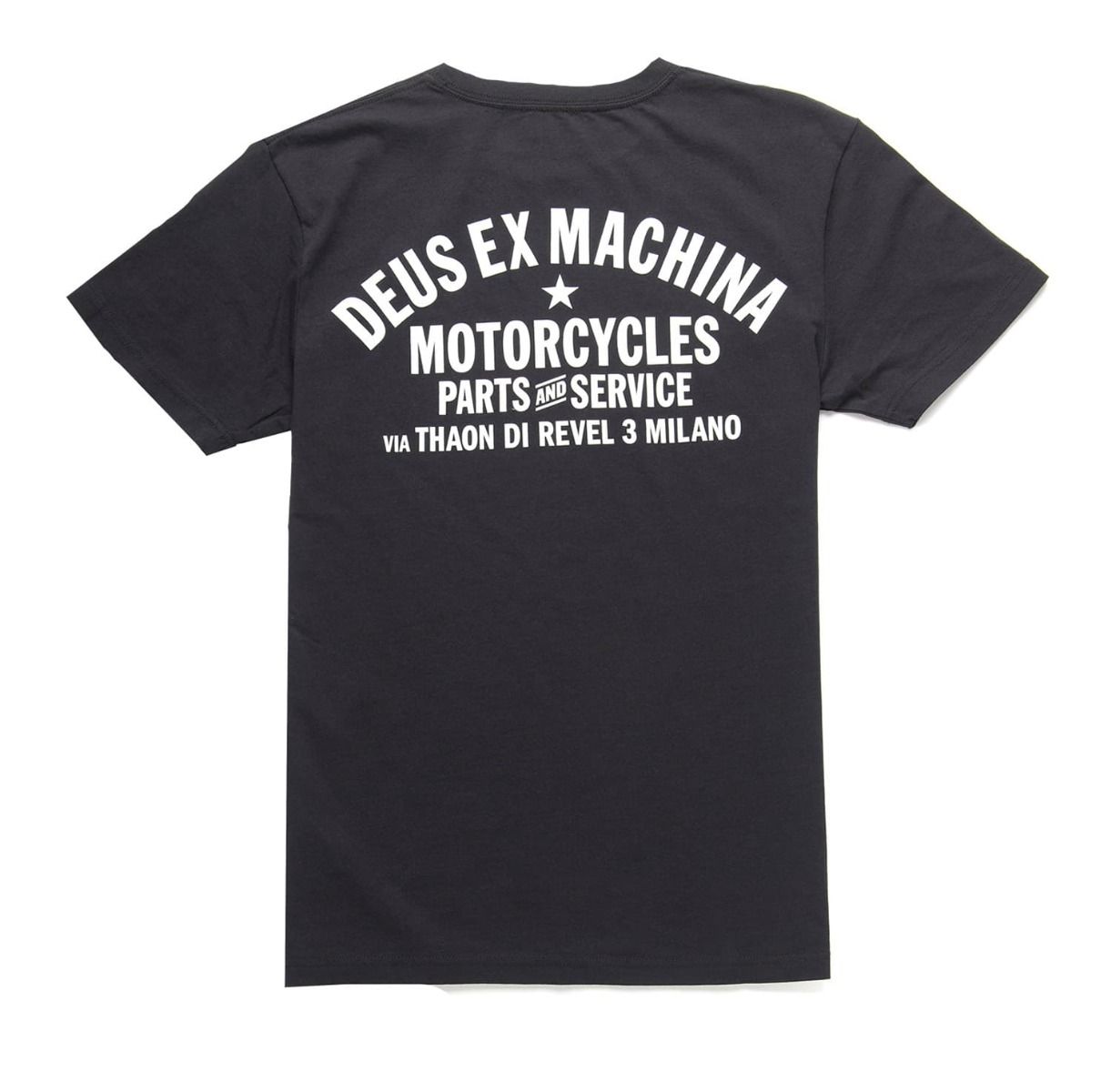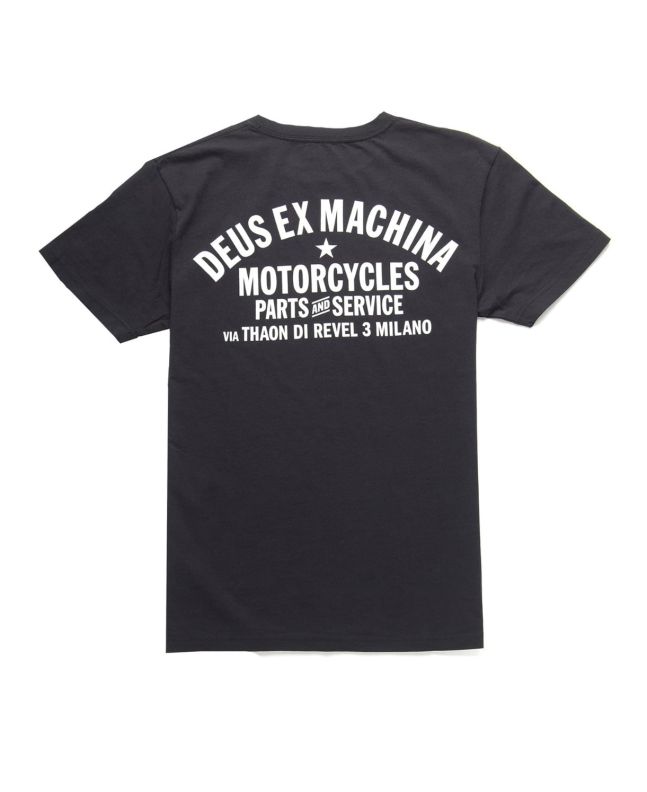 La camiseta de manga corta Milano Address negra tiene una etiqueta de Deus Ex Machina tejida en el cuello interior.