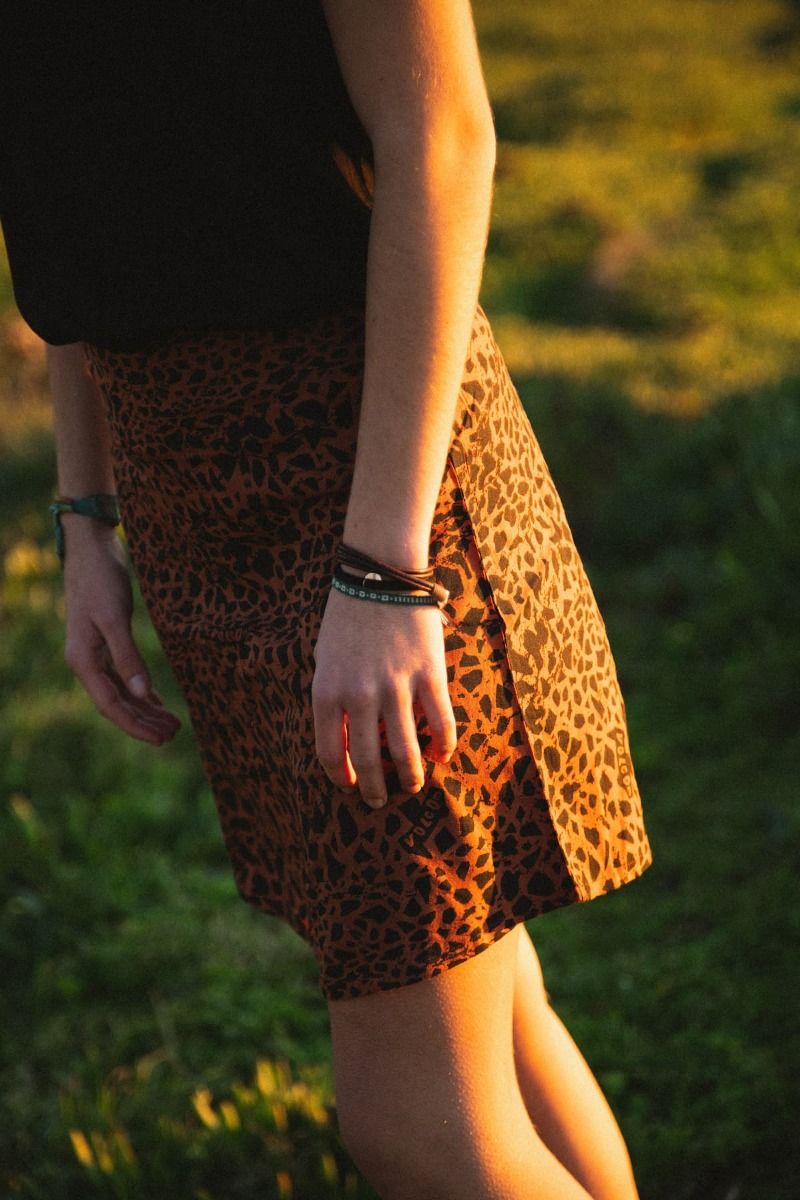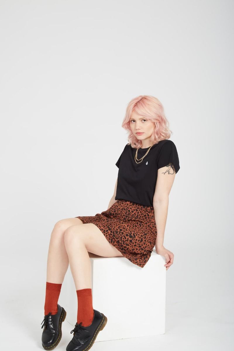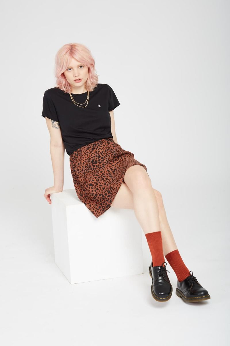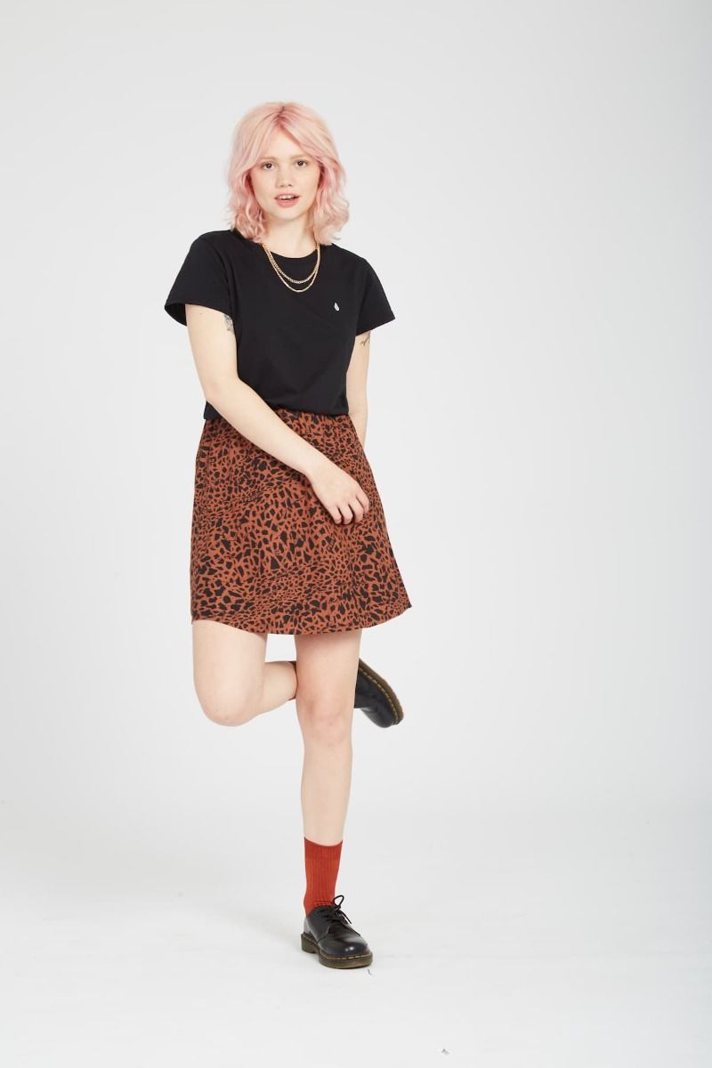 La falda corta Dino Tea Skirt en tono marrón con detalles estampados (Dark Clay) de Volcom está confeccionada con 100% viscosa FSC.