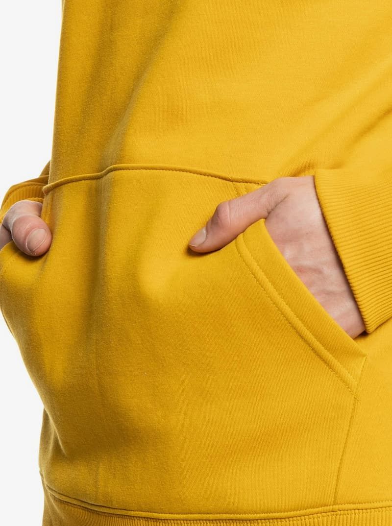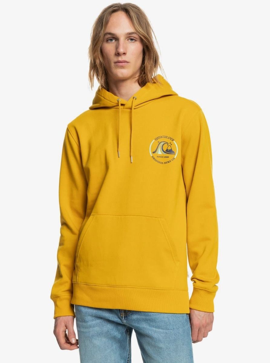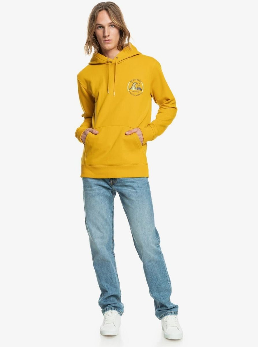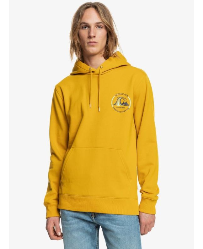 Este hoodie de corte normal, clásico y cómodo, cuenta capucha con cordones ajustables redondeados de algodón orgánico con ojales metálicos, un amplio bolsillo tipo canguro, punto canalé en puños y parte inferior, estampado original Quiksilver en el frente, y un gran estampado en la espalda.