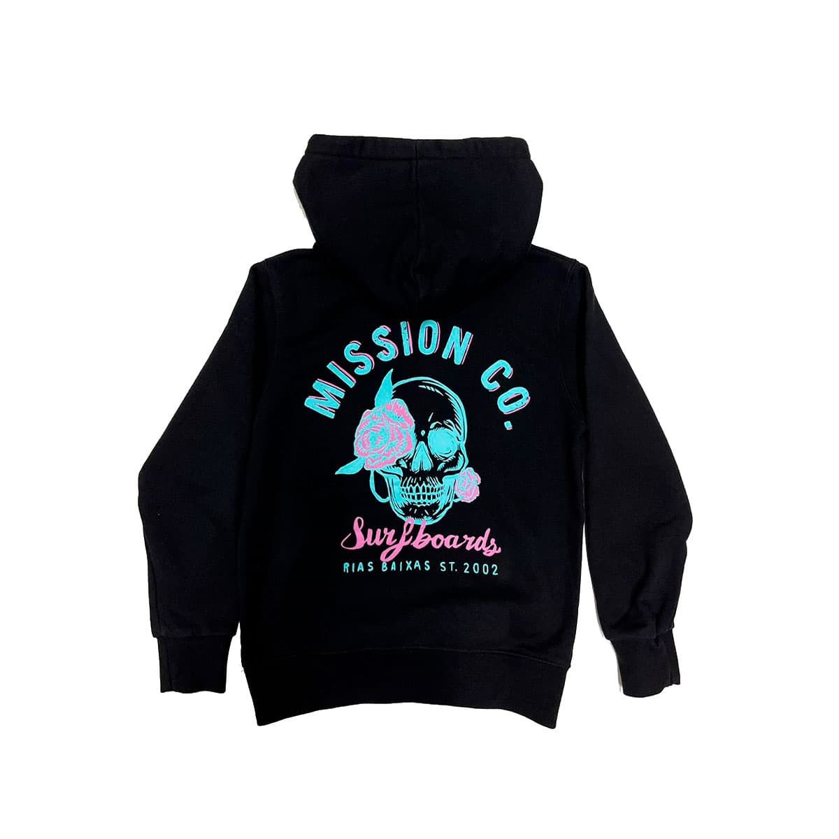 Este cómodo hoodie surfero juvenil cuenta con capucha ajustable mediante cordón, puños y dobladillo inferior acanalados, un amplio bolsillo tipo canguro, tejido pre-lavado que no encoge, forro interior cepillado, estampado "Mission Co. Surfboards" en el lado izquierdo del pecho, un gráfico de la calavera Mission con una rosa, junto con la inscripción "Mission Co. Surfboards. Rías Baixas. ST. 2002" y una discreta etiqueta con el logo de la "M" de Mission tejida en el bolsillo.