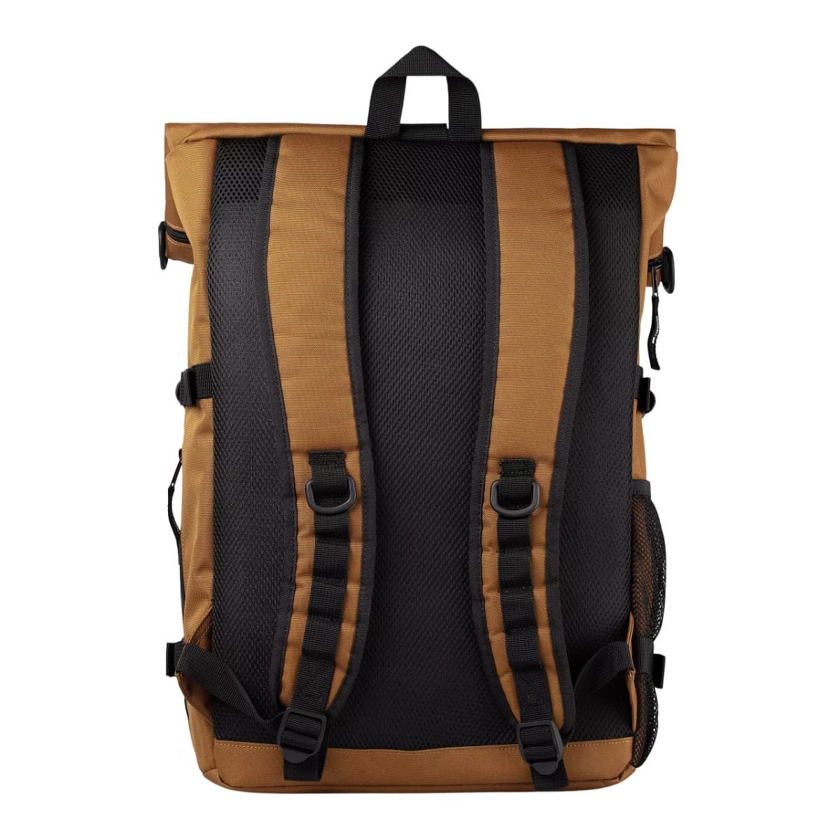 Esta mochila impermeable marrón hamilton cuenta con diseño ampliable, un compartimento principal sin forro con cierre de solapa y cremallera, un bolsillo interior acolchado para portátiles de hasta 15", un bolsillo lateral de malla para la botella de agua, un bolsillo lateral con cremallera, un bolsillo delantero con solapa y cremallera de fácil acceso, correas de compresión, espalda de malla transpirable y acolchada, correas de hombro acolchadas y ajustables, asa superior y una etiqueta cuadrada con el logo de Carhartt tejida en el bolsillo delantero.