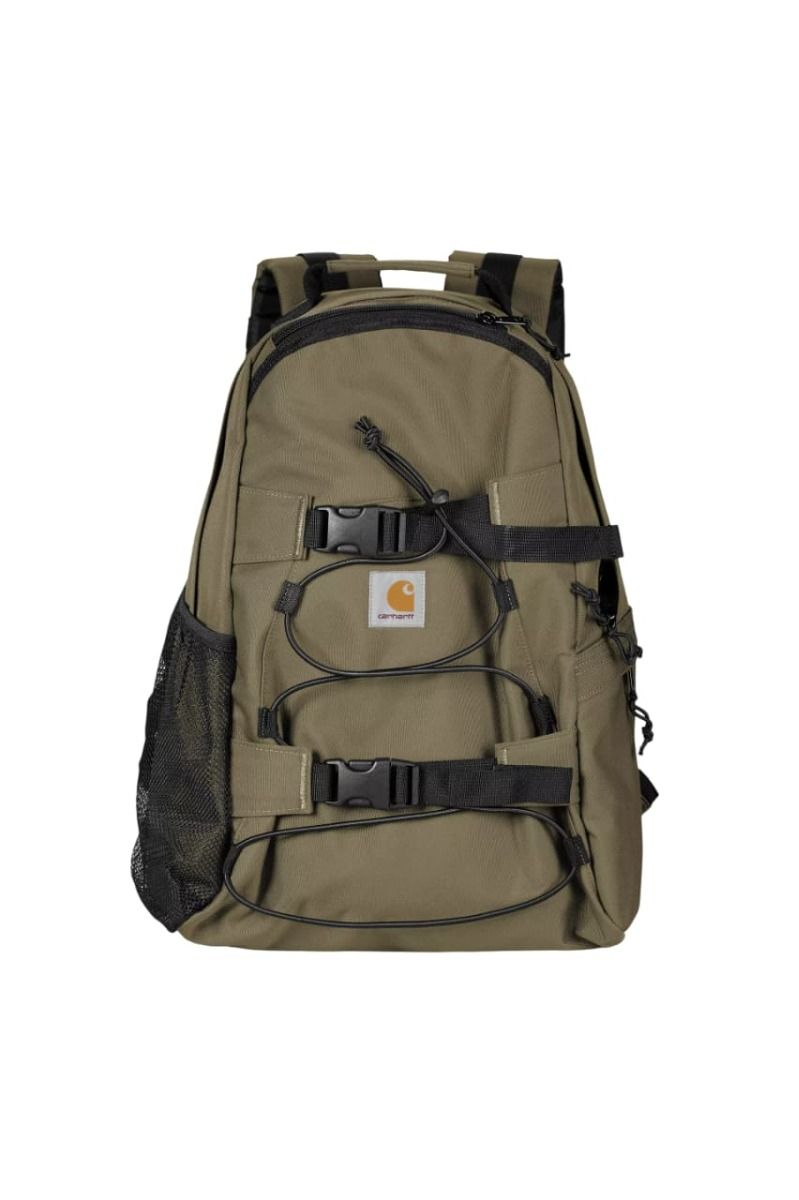 Mochila Carhartt WIP Kickflip Backpack Brass de 24,8L. Lona resistente al agua, múltiples bolsillos y correas frontales para el skate. Comodidad y funcionalidad urbana.