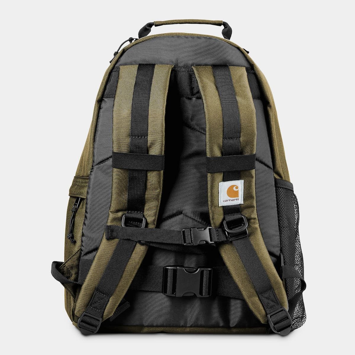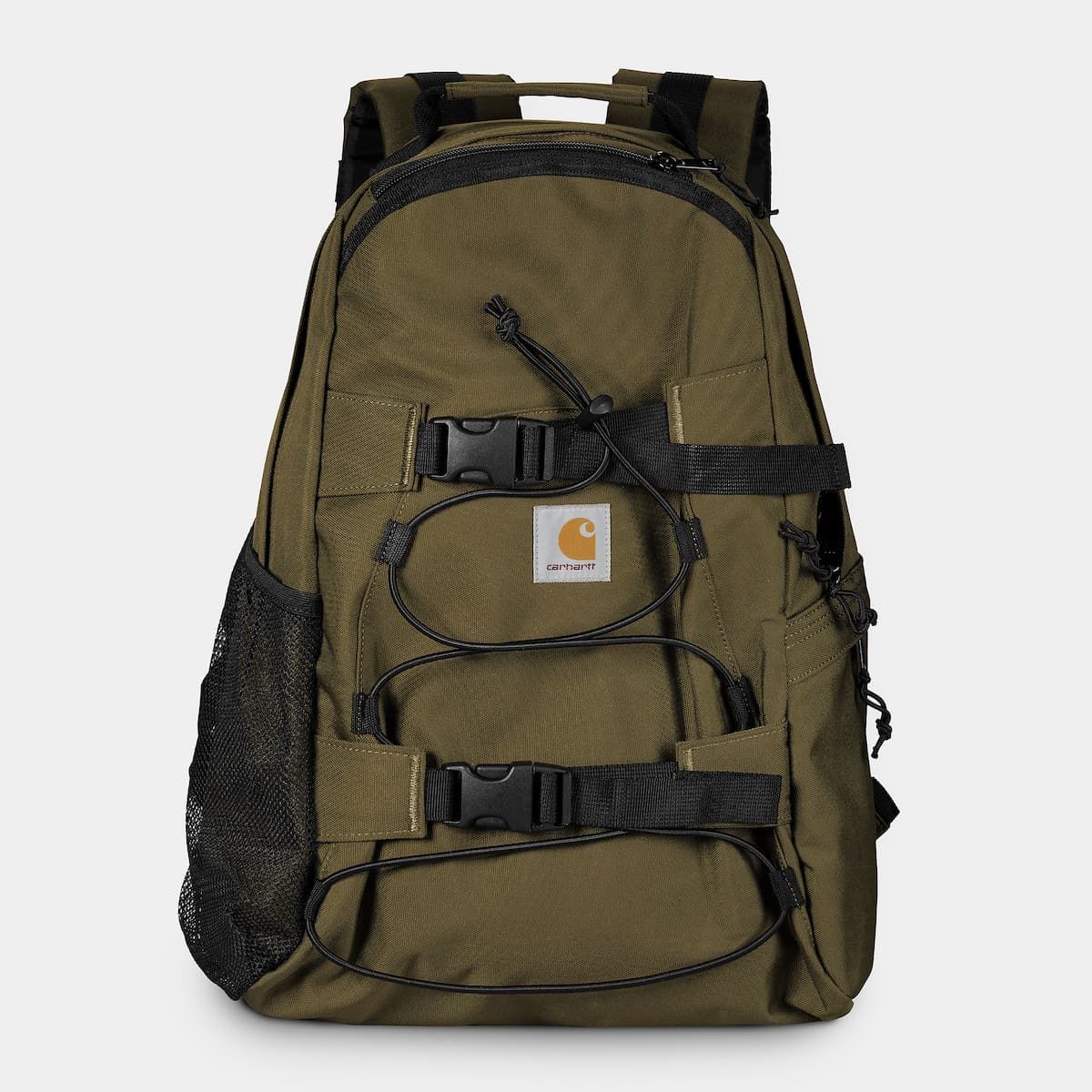 Esta mochila de skateboard sin forro cuenta con lona que repele el agua, un compartimento principal con cierre de cremallera birideccional, un bolsillo de acceso superior, un bolsillo lateral de malla, un bolsillo lateral con cremallera, espalda acolchada, correas de hombro acolchadas y ajustables, asa superior, correas delanteras para sujetar el monopatín y una etiqueta cuadrada con el logo de Carhartt tejida en la parte delantera y en la correa izquierda.