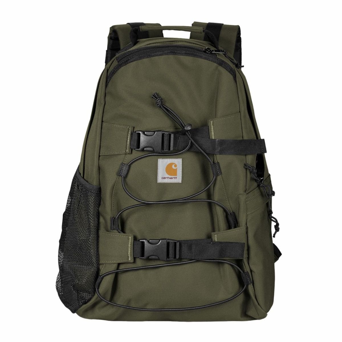 Esta mochila de skateboard verde sin forro cuenta con lona que repele el agua, un compartimento principal con cierre de cremallera bidireccional, un bolsillo de acceso superior, un bolsillo lateral de malla, un bolsillo lateral con cremallera, espalda acolchada, correas de hombro acolchadas y ajustables, asa superior, correas delanteras para sujetar el monopatín y una etiqueta cuadrada con el logo de Carhartt tejida en la parte delantera y en la correa izquierda.