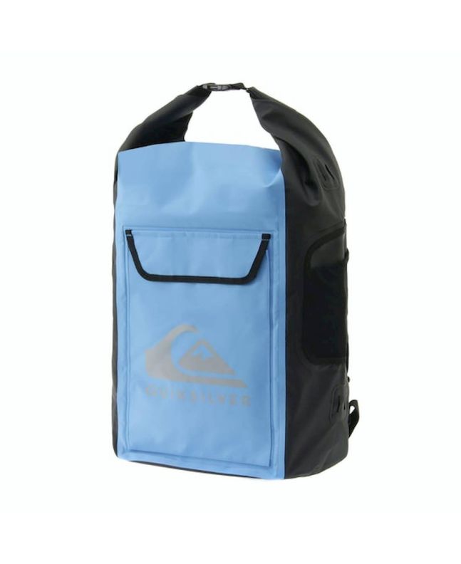Cuenta con múltiples compartimentos, un amplio compartimento principal con cierre superior enrollable, bolsillos laterales de malla, bolsillo interior, bolsillo para botella, compartimento para traje de surf, y el logo de Quiksilver serigrafiado.