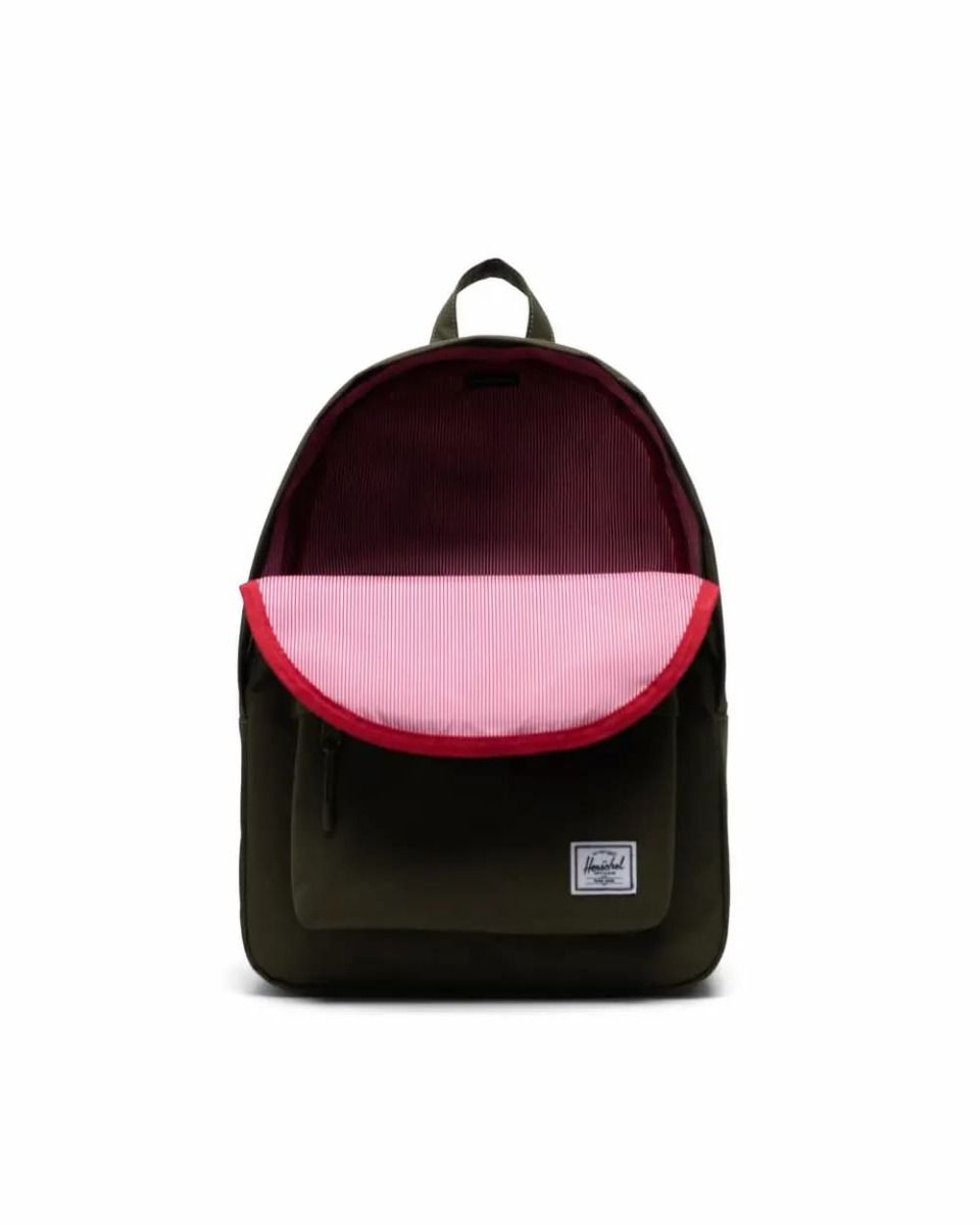 Esta mochila, perteneciente a la colección Herschel Classic™, cuenta con un diseño sencillo pensado para el día a día, un amplio compartimento principal con el forro de tela a rayas rojas y blancas característico de Herschel, bolsillo delantero, cierres de cremallera con tiradores de nudo Prusik, asa superior, correas de hombro ajustables y un parche de Herschel Supply Company tejido en el frente.
