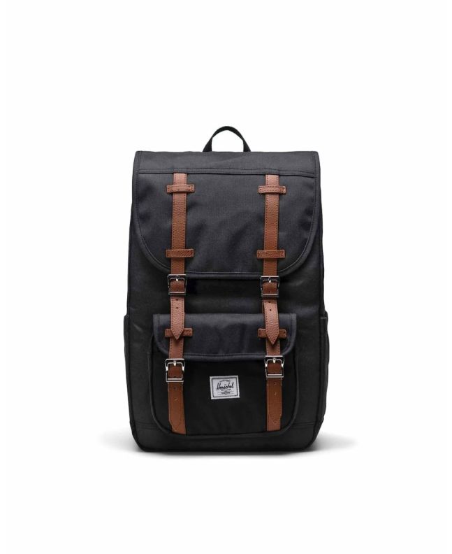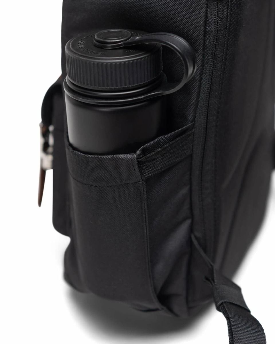 Esta versión reducida del modelo de estilo montañero emblemático de Herschel en color negro cuenta con un amplio compartimento principal con forro interior EcoSystem de rayas tonales 100% reciclado, cierre de cordón, correas marrones de cierre magnético y hebillas metálicas, funda interior acolchada para portátiles de hasta 15"/16", bolsillo delantero con cremallera, organizador y mosquetón para llaves, bolsillo lateral de cremallera para objetos de acceso rápido, bolsillo lateral para botellas de agua, bolsillo oculto para gafas de sol y/o objetos pequeños, panel posterior acolchado, asa superior, correas de hombro moldeadas, acolchadas y ajustables de EVA, una etiqueta interior "Put Yourself Out There" y un parche de tela de Herschel Supply Company tejido en el bolsillo delantero.