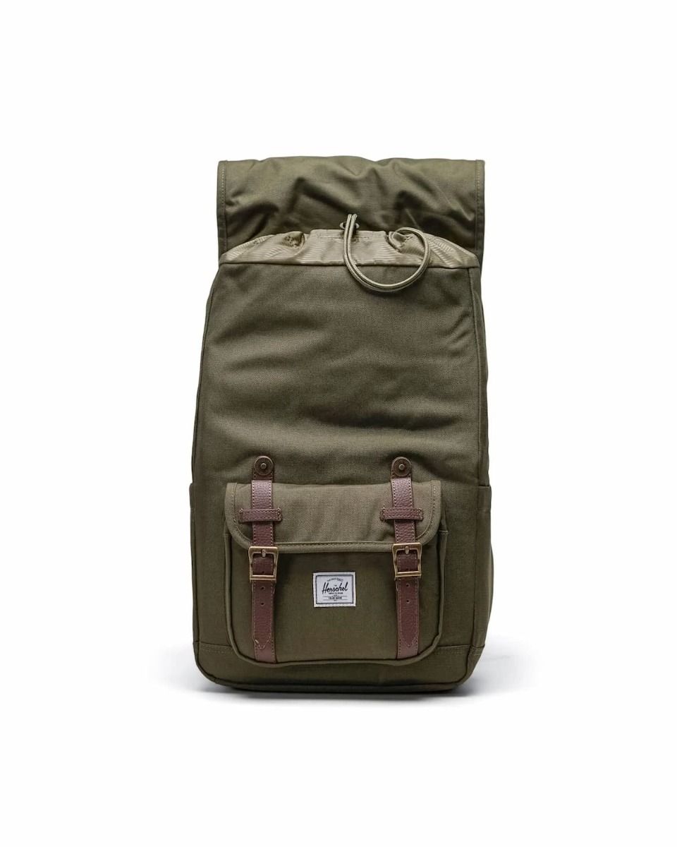 Esta versión reducida del modelo de estilo montañero emblemático de Herschel en color verde militar cuenta con un amplio compartimento principal con forro interior EcoSystem de rayas tonales 100% reciclado, cierre de cordón, correas marrones de cierre magnético y hebillas metálicas, funda interior acolchada para portátiles de hasta 15"/16", bolsillo delantero con cremallera, organizador y mosquetón para llaves, bolsillo lateral de cremallera para objetos de acceso rápido, bolsillo lateral para botellas de agua, bolsillo oculto para gafas de sol y/o objetos pequeños, panel posterior acolchado, asa superior, correas de hombro moldeadas, acolchadas y ajustables de EVA, una etiqueta interior "Put Yourself Out There" y un parche de tela de Herschel Supply Company tejido en el bolsillo delantero.