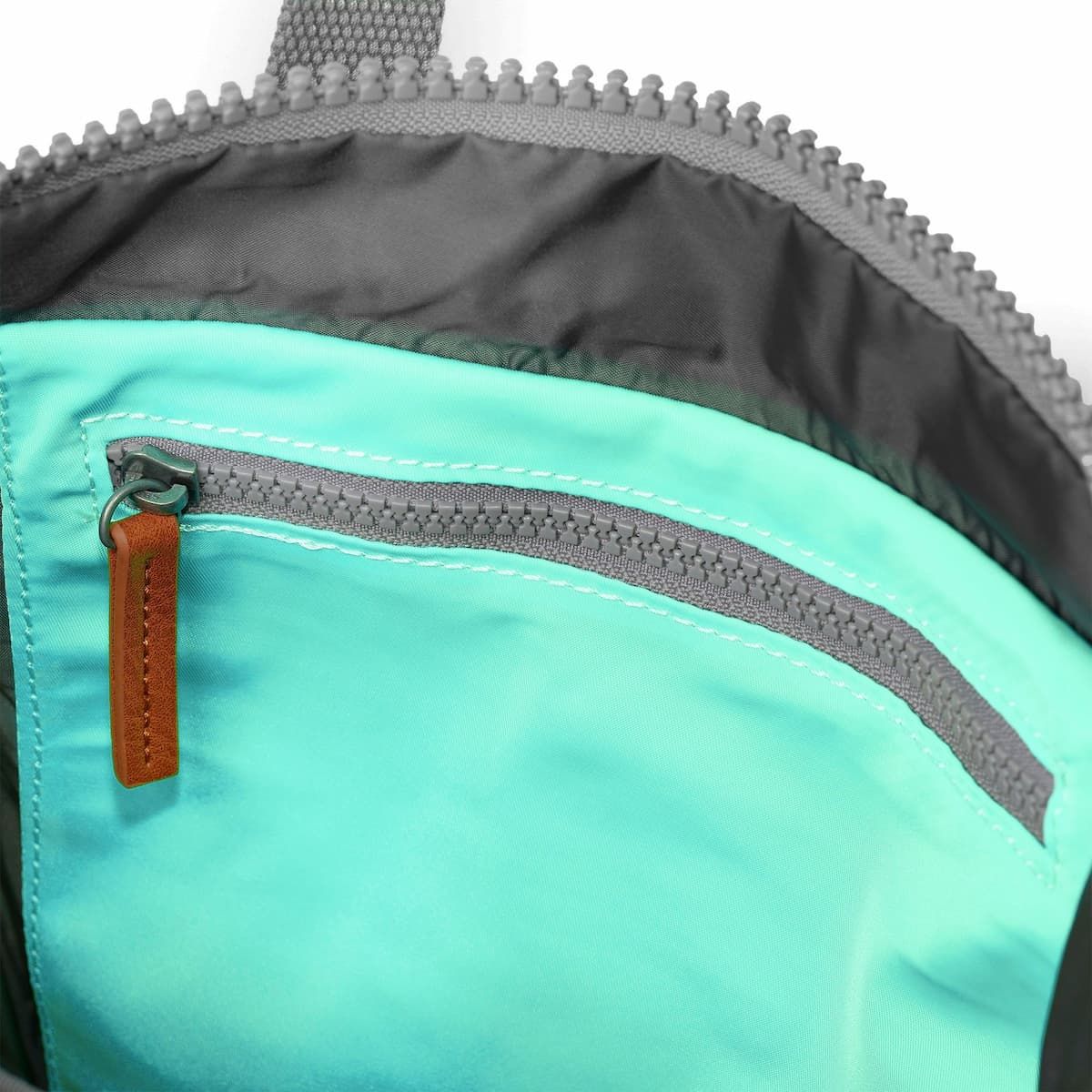 La mochila para hombre y mujer Canfield B Sustainable Nylon Medium Capri viene equipada con un amplio compartimento principal con tapa superior enrollable, cremallera y cierre magnético, un bolsillo frontal cerrado por una gruesa cremallera, un bolsillo exterior secreto, un bolsillo interior de cremallera, un compartimento interior acolchado para portátiles de hasta 15", dos bolsillos laterales para tus botellas de agua, panel posterior acolchado para soporte adicional, correas de hombro ajustables y asas anchas de lazo hechas de algodón para transportarla cómodamente a la espalda o con la mano, un parche de tela con el logo de Roka London tejido en el bolsillo delantero y una etiqueta de garantía Recycled & Repurposed Roka London Trademark cosida en la parte posterior.