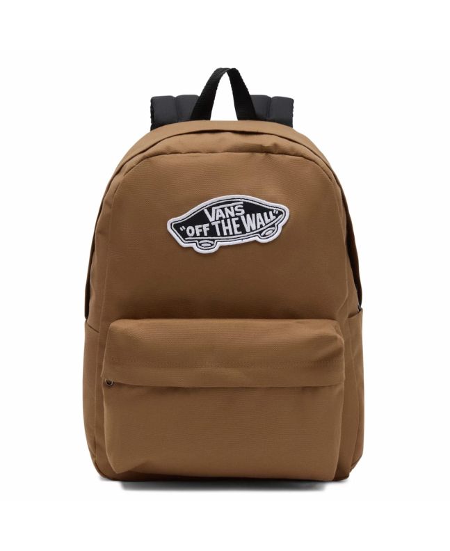 Esta mochila escolar de estilo clásico en color marrón cuenta con un compartimento principal grande con cierre de cremallera, una funda interior para portátiles de hasta 15 pulgadas, un bolsillo frontal con compartimento organizador, interior con el emblemático estampado checkerboard, un bolsillo lateral para la botella de agua, asa superior, correas de hombro ajustables y acolchadas de corte recto, el emblemático parche con el logotipo del skate «Off The Wall» tejido en el frontal y una etiqueta de Vans® cosida en la correa izquierda.