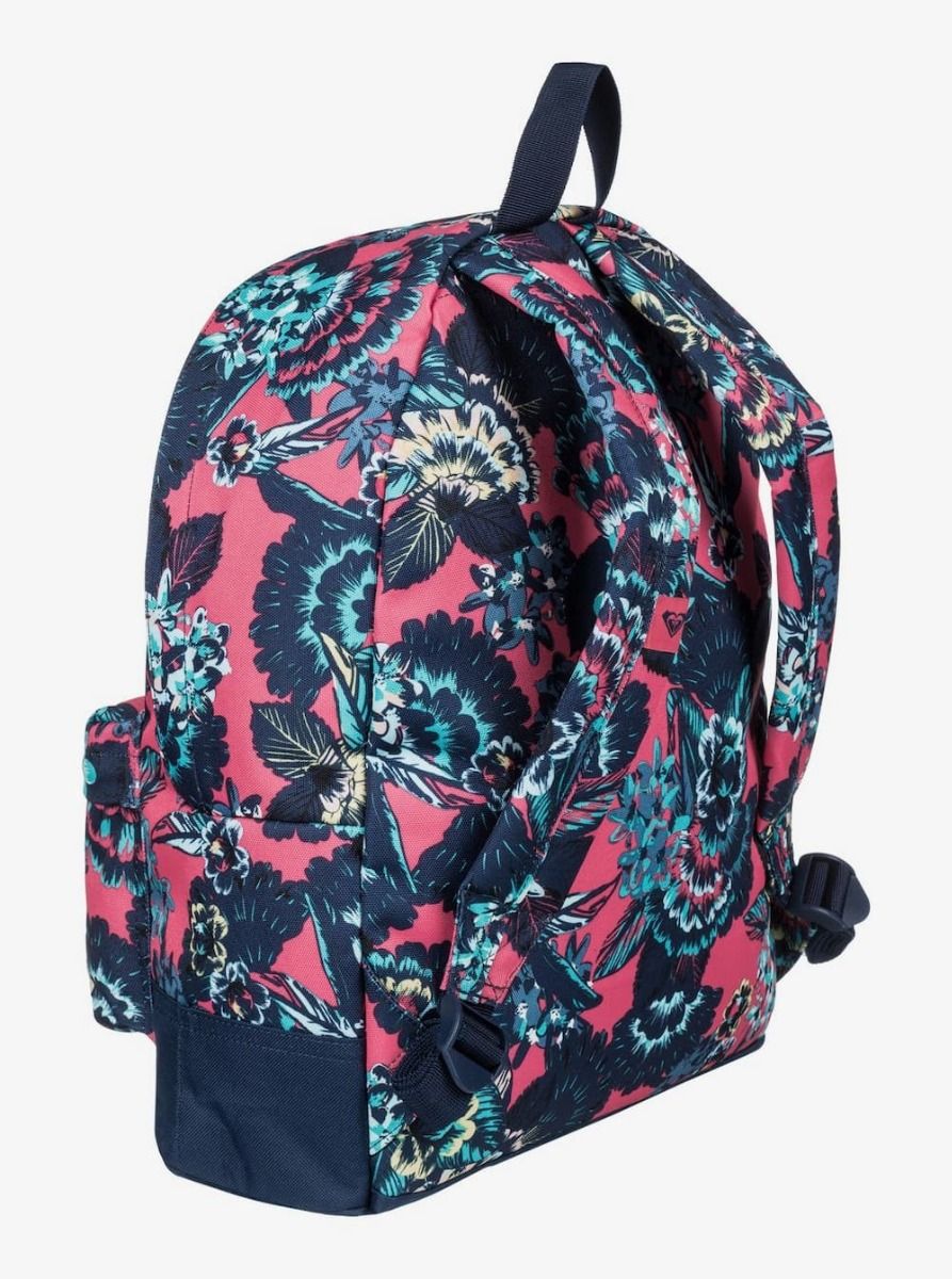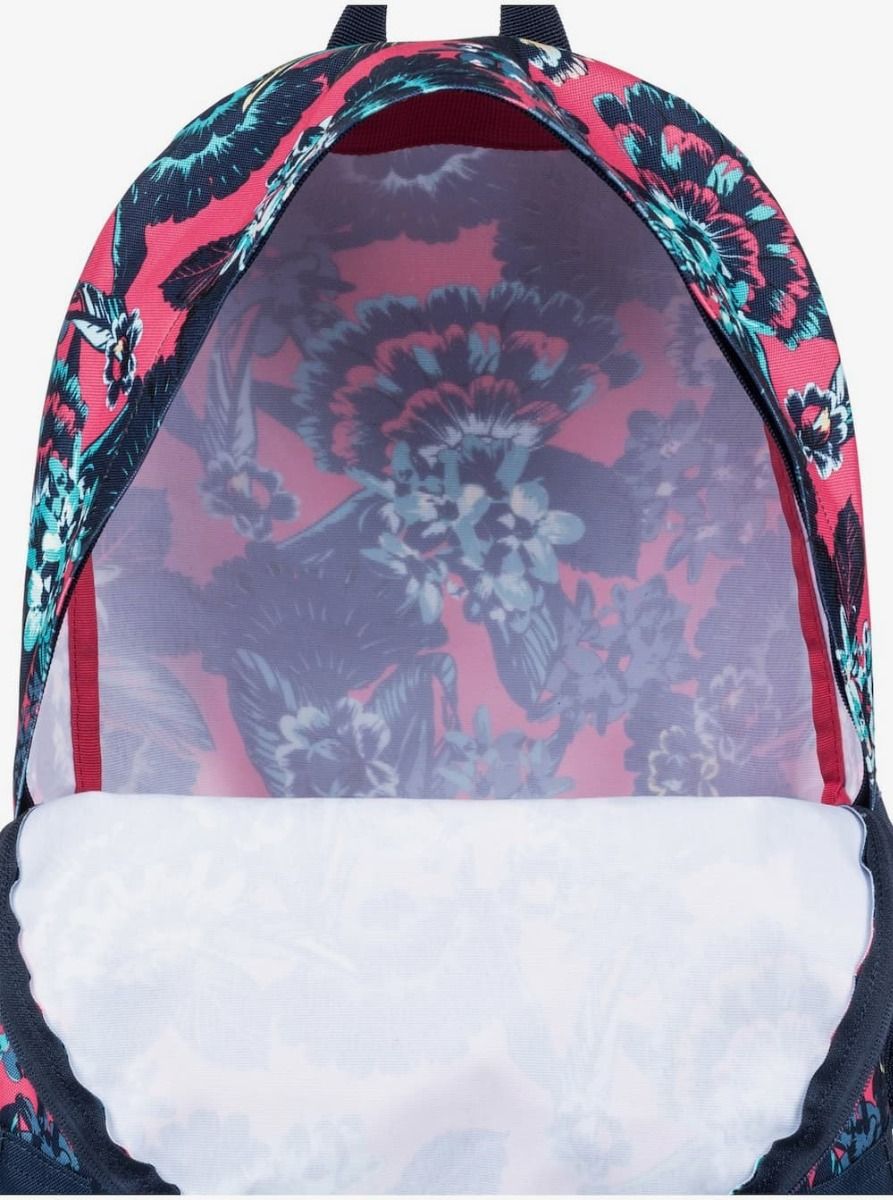 Esta mochila cuenta con un compartimento principal con cierre de cremallera, bolsillo frontal con cremallera, parte inferior lisa, correas de hombro ajustables y acolchadas, asa superior, *estampado floral integral y un parche de algodón con el logo de Roxy tejido en la parte delantera.