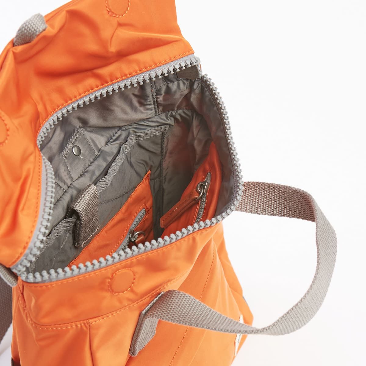 La mochila para hombre y mujer Canfield B Sustainable Nylon Small Burnt Orange viene equipada con un compartimento principal con tapa superior enrollable, cremallera y cierre magnético, un bolsillo frontal cerrado por una gruesa cremallera, un bolsillo exterior secreto, un bolsillo interior de cremallera, un compartimento interior acolchado para tablets y portátiles pequeños, panel posterior acolchado para soporte adicional, correas de hombro ajustables y asas anchas de lazo hechas de algodón para transportarla cómodamente a la espalda o de lado, un parche de tela con el logo de Roka tejido en el bolsillo delantero y una etiqueta de garantía Roka London cosida en la parte posterior.