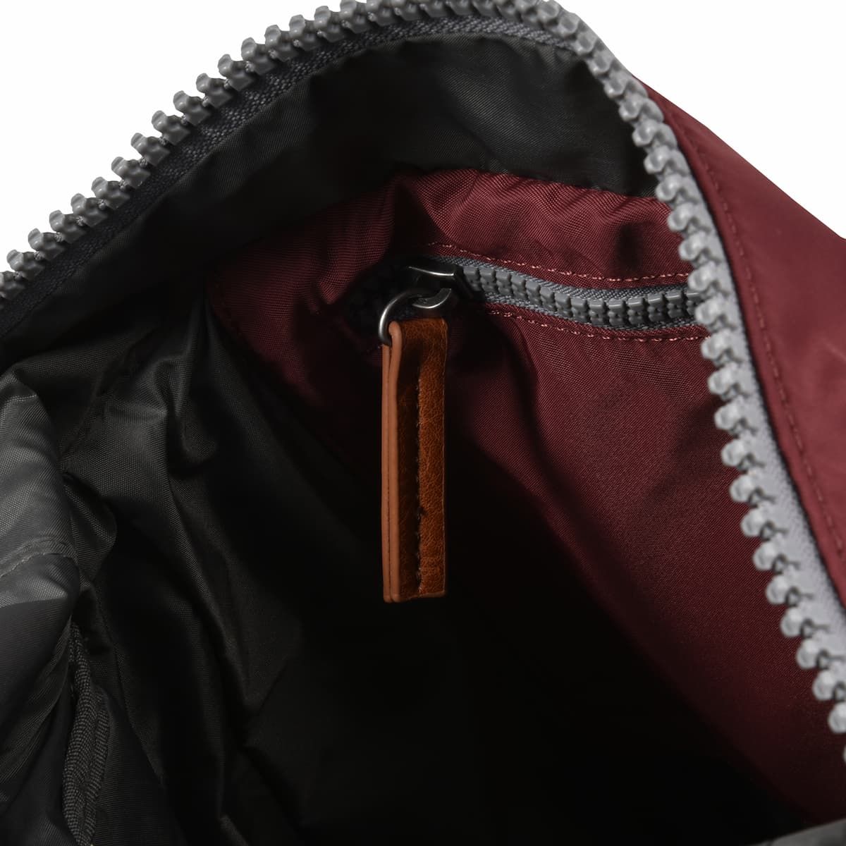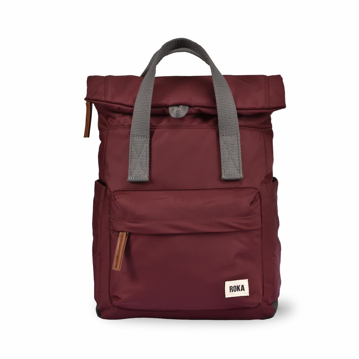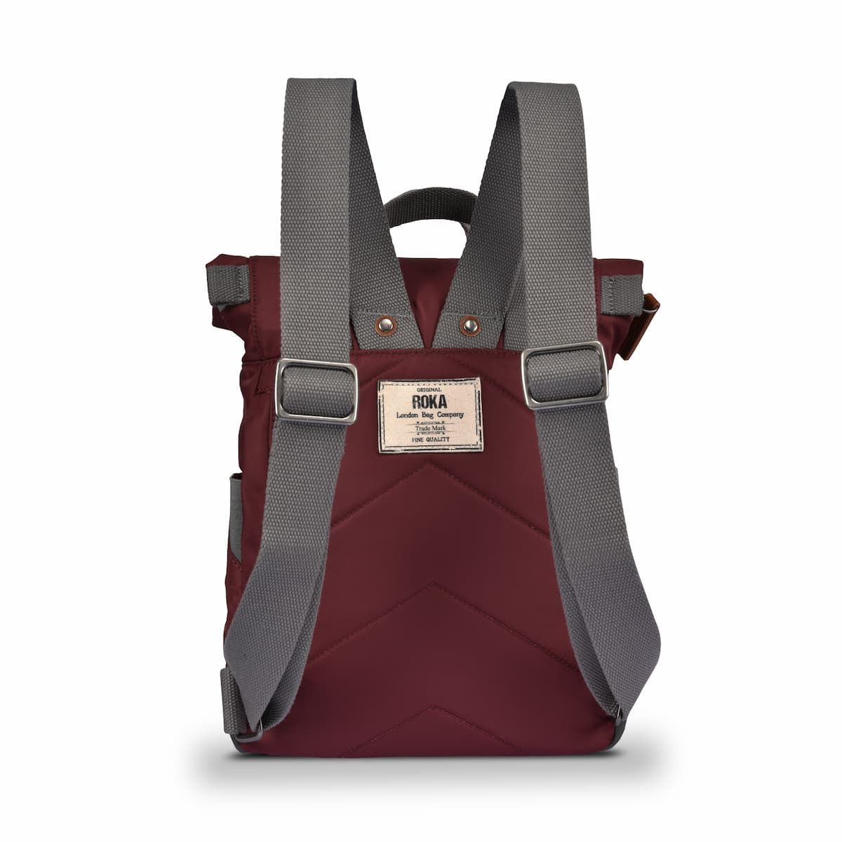La mochila pequeña impermeable con tapa enrollable Canfield B Sustainable Nylon Small 7L en color granate (Port) de Roka London está fabricada con materiales 100% veganos como el nailon reciclado, que le aporta un aspecto brillante y mayor suavidad al tacto.