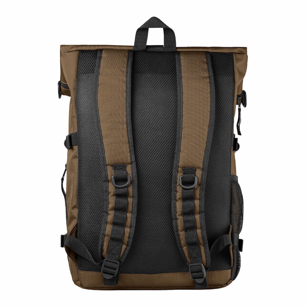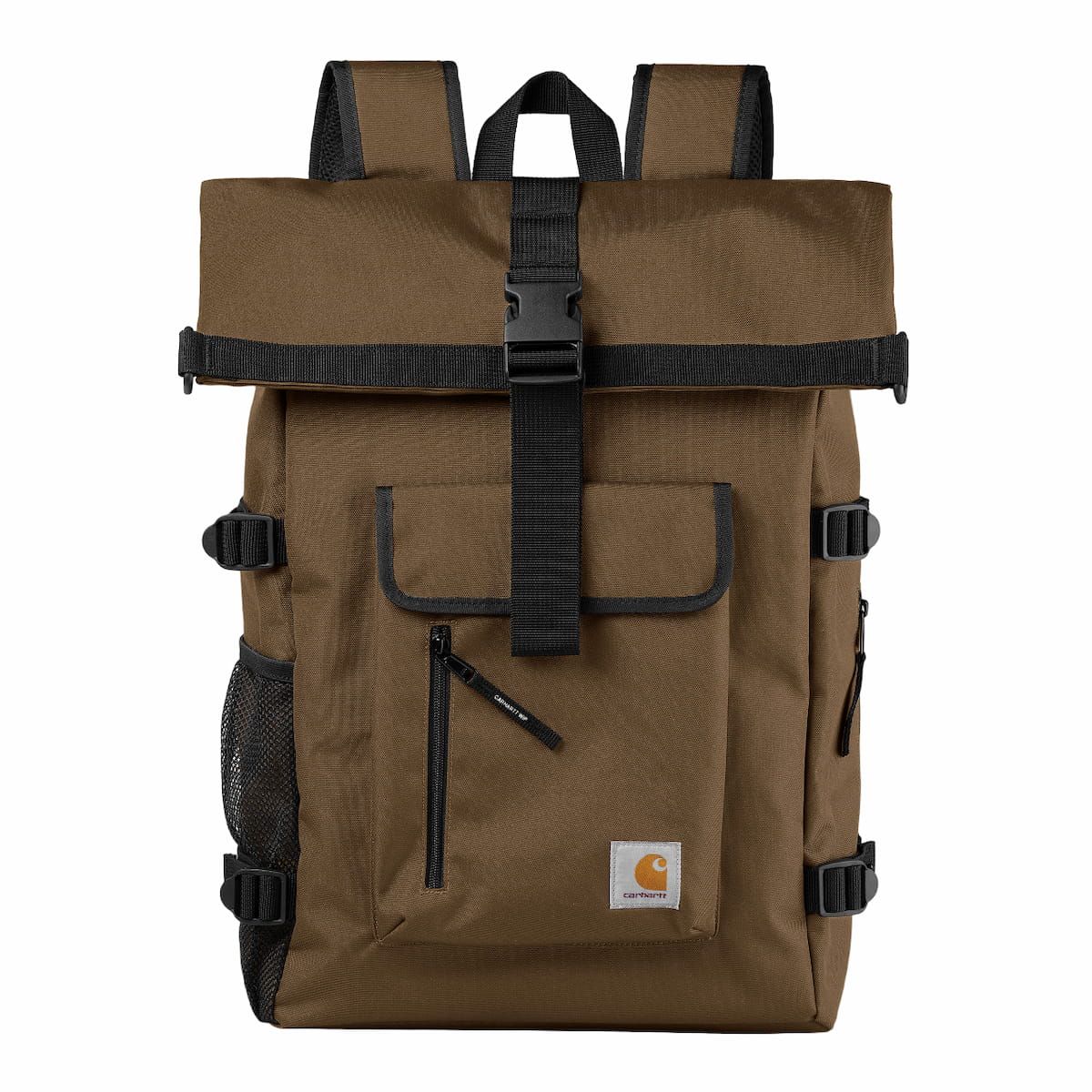 Esta mochila impermeable amarronada cuenta con diseño ampliable, un compartimento principal sin forro con cierre de solapa y cremallera, un bolsillo interior acolchado para portátiles de hasta 15", un bolsillo lateral de malla para la botella de agua, un bolsillo lateral con cremallera, un bolsillo delantero con solapa y cremallera de fácil acceso, correas de compresión, espalda de malla transpirable y acolchada, correas de hombro acolchadas y ajustables, asa superior y una etiqueta cuadrada con el logo de Carhartt tejida en el bolsillo delantero.