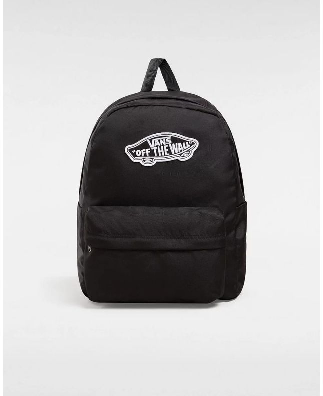 Esta mochila escolar de estilo clásico en color negro cuenta con un compartimento principal grande con cierre de cremallera, una funda interior para portátiles de hasta 15 pulgadas, un bolsillo frontal con compartimento organizador, interior con el emblemático estampado checkerboard, un bolsillo lateral para la botella de agua, asa superior, correas de hombro ajustables y acolchadas de corte recto, el emblemático parche con el logotipo del skate «Off The Wall» tejido en el frontal, el logotipo Checkerboard Globe y una etiqueta de Vans® cosida en la correa izquierda.