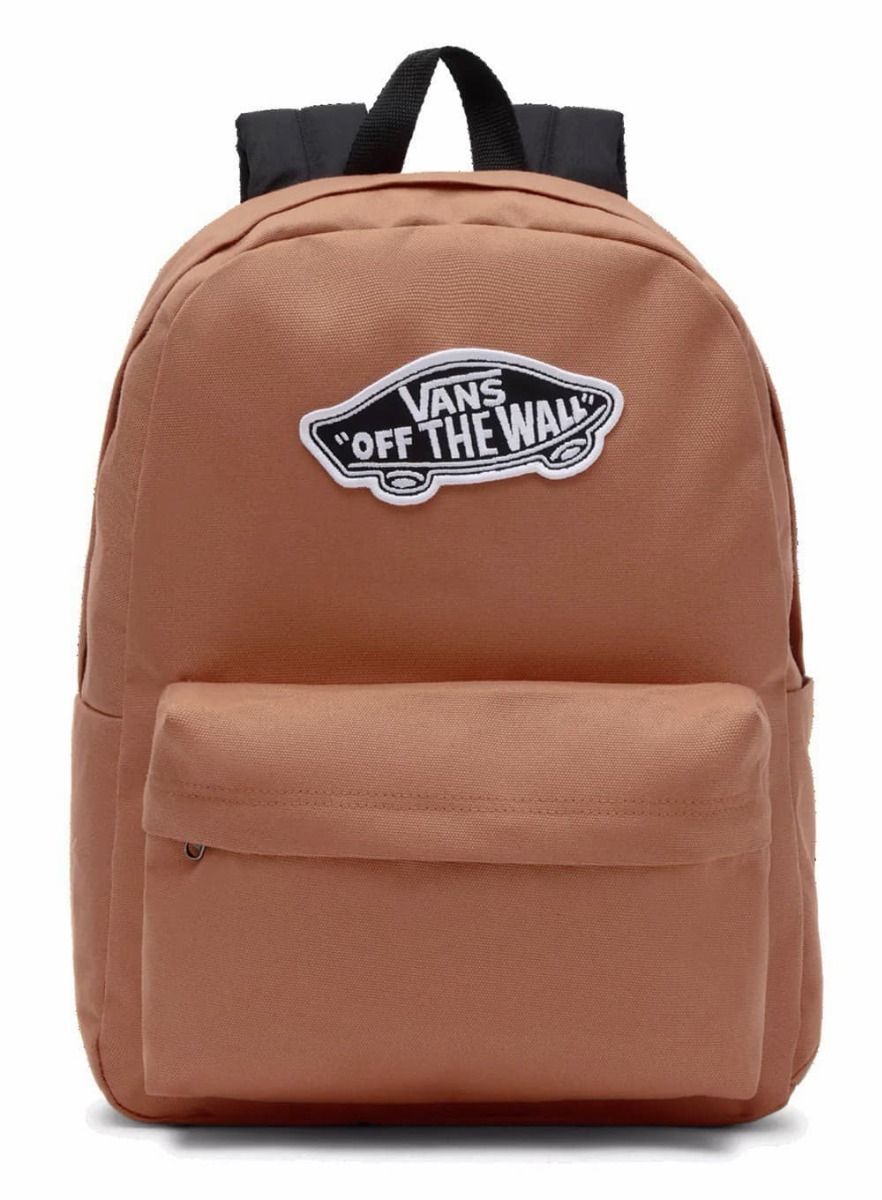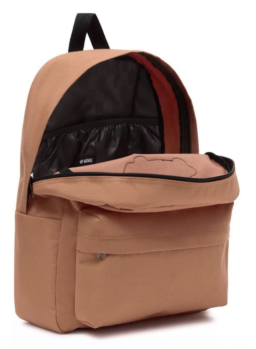 Esta mochila escolar de estilo clásico en color naranja cornalina cuenta con un compartimento principal grande con cierre de cremallera, una funda interior para portátiles de hasta 15 pulgadas, un bolsillo frontal con compartimento organizador, interior con el emblemático estampado checkerboard, un bolsillo lateral para la botella de agua, asa superior, correas de hombro ajustables y acolchadas de corte recto, el emblemático parche con el logotipo del skate «Off The Wall» tejido en el frontal y una etiqueta de Vans® cosida en la correa izquierda.