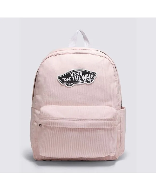 Esta mochila escolar de estilo clásico en un suave color rosa sepia cuenta con un compartimento principal grande con cierre de cremallera, una funda interior para portátiles de hasta 15 pulgadas, un bolsillo frontal con compartimento organizador, interior con el emblemático estampado checkerboard, un bolsillo lateral para la botella de agua, asa superior, correas de hombro ajustables y acolchadas de corte recto, el emblemático parche con el logotipo del skate «Off The Wall» tejido en el frontal, el logotipo Checkerboard Globe y una etiqueta de Vans® cosida en la correa izquierda.