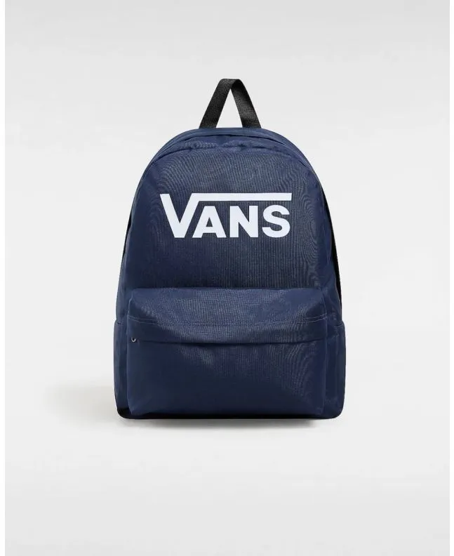 Esta mochila azul marino (Dress Blues) tipo escolar de estilo clásico cuenta con un compartimento principal grande con cremallera, un bolsillo delantero con compartimento organizador, asa superior, correas de hombro ajustables y acolchadas de corte recto y el logo de "Vans" impreso en color blanco en la parte delantera.