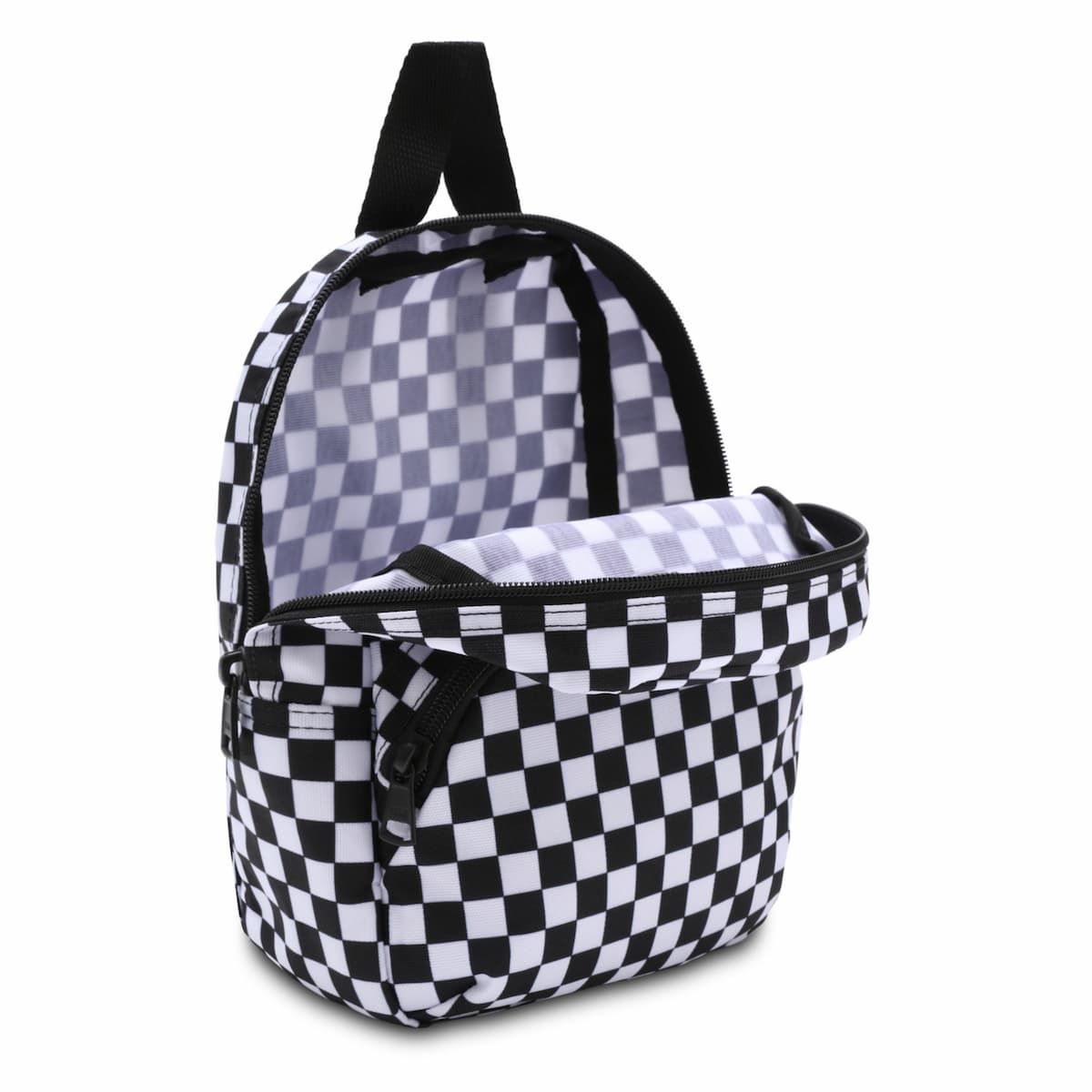 Esta versión reducida de las clásicas mochilas de Vans cuenta con dos compartimentos con cierre de cremallera, estampado checkerboard, correas de hombro ajustables, asa superior y el emblemático parche con el logotipo del skate «Off The Wall» tejido en el frontal.