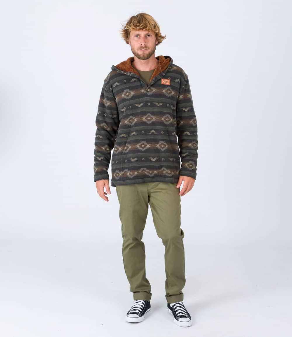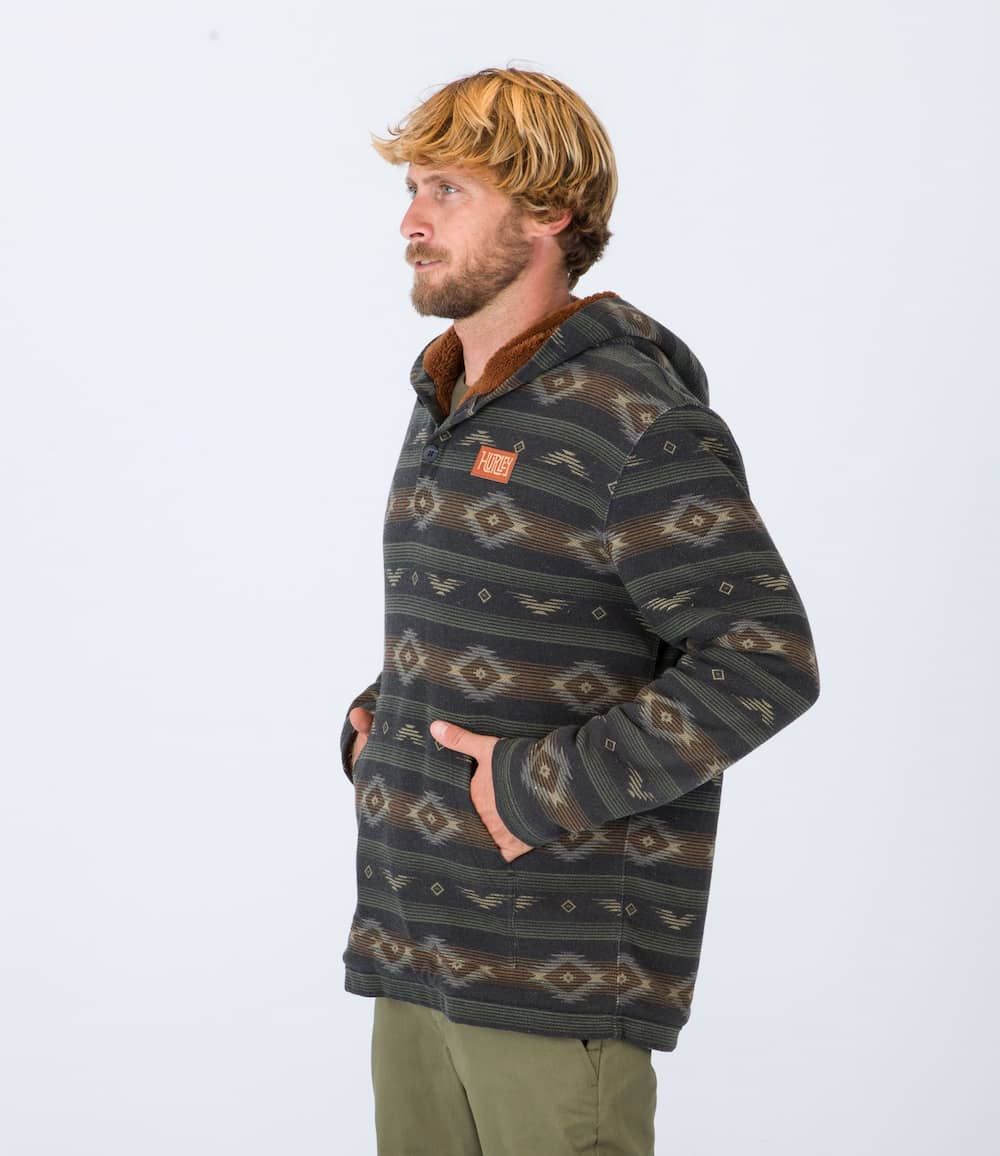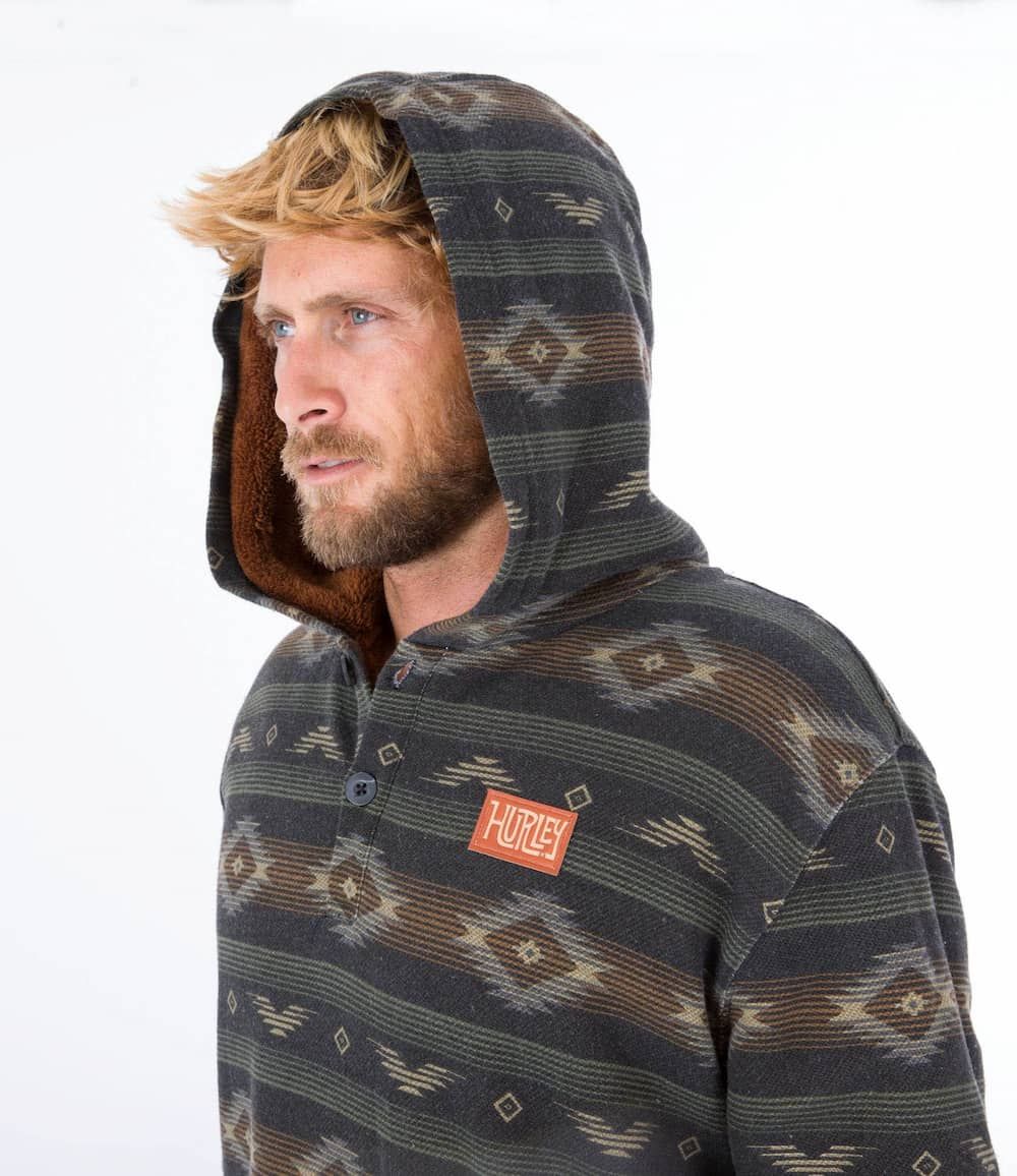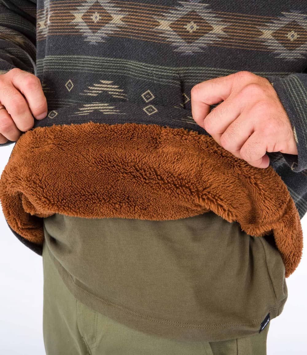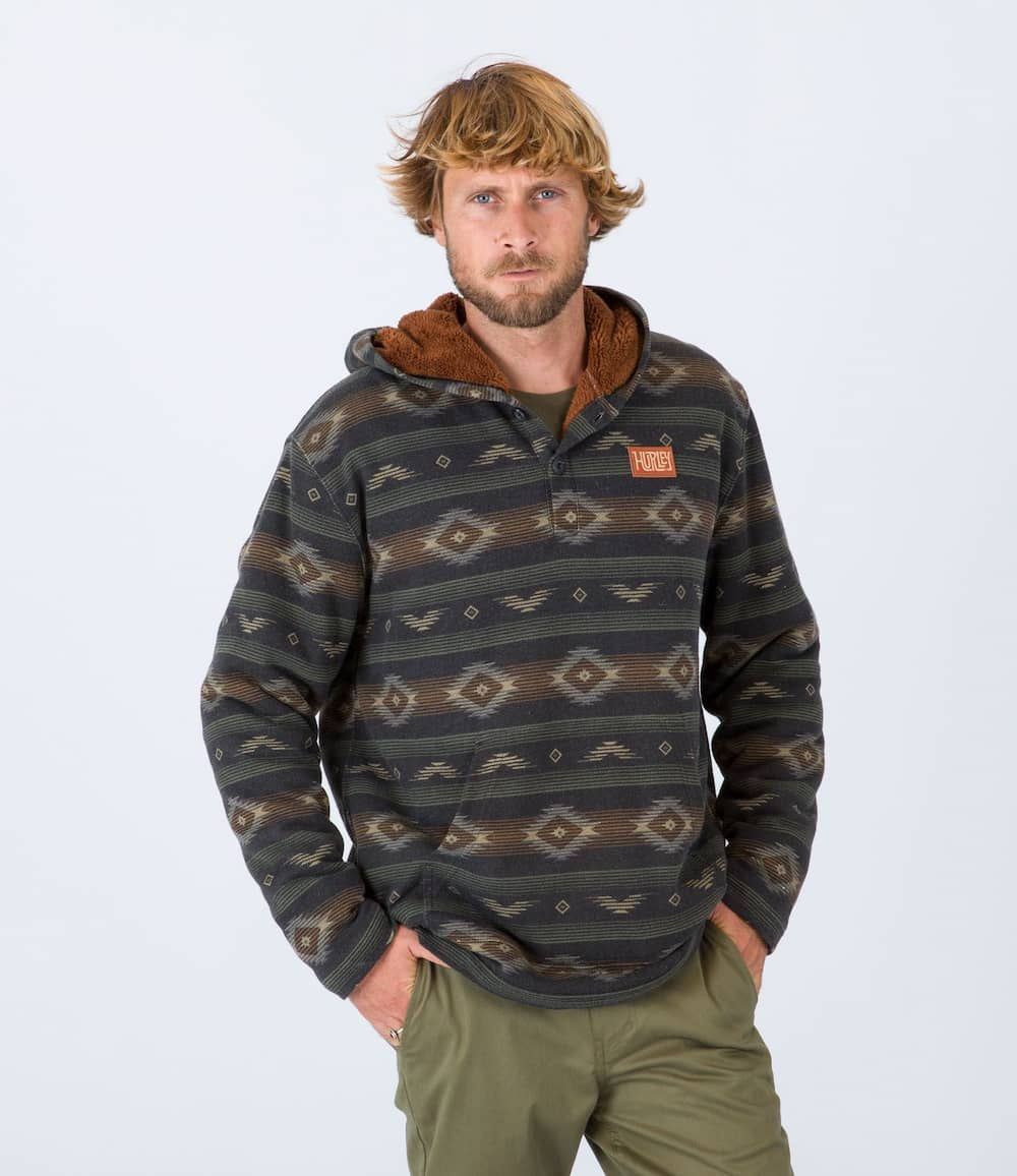Este cálido hoodie cuenta con tejido French terry (220 g/m²), forro interior de sherpa, capucha, estampado con hilo teñido, cuello con cierre de botones, bolsillo delantero tipo canguro y un parche de tela Hurley tejido en el lado izquierdo del pecho.