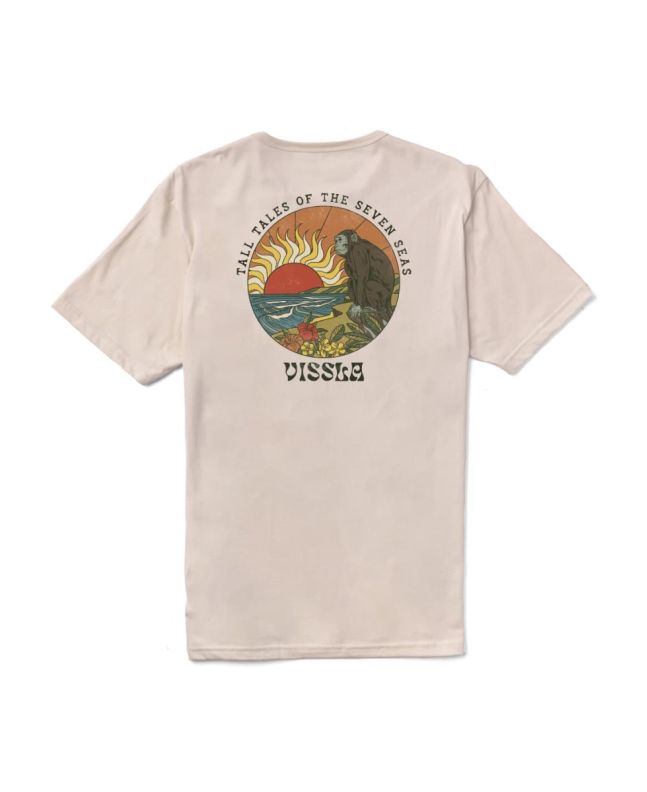 Esta camiseta orgánica Premium de corte moderno viene con cuello redondo, manga corta, costuras laterales, lavado vintage para un tacto suave y un aspecto desgastado, serigrafiado suave Vissla en la parte delantera, junto con un estampado gráfico de un mono disfrutando de la puesta del sol con la inscripción "Tall Tales Of The Seven Seas" impresos en la espalda.