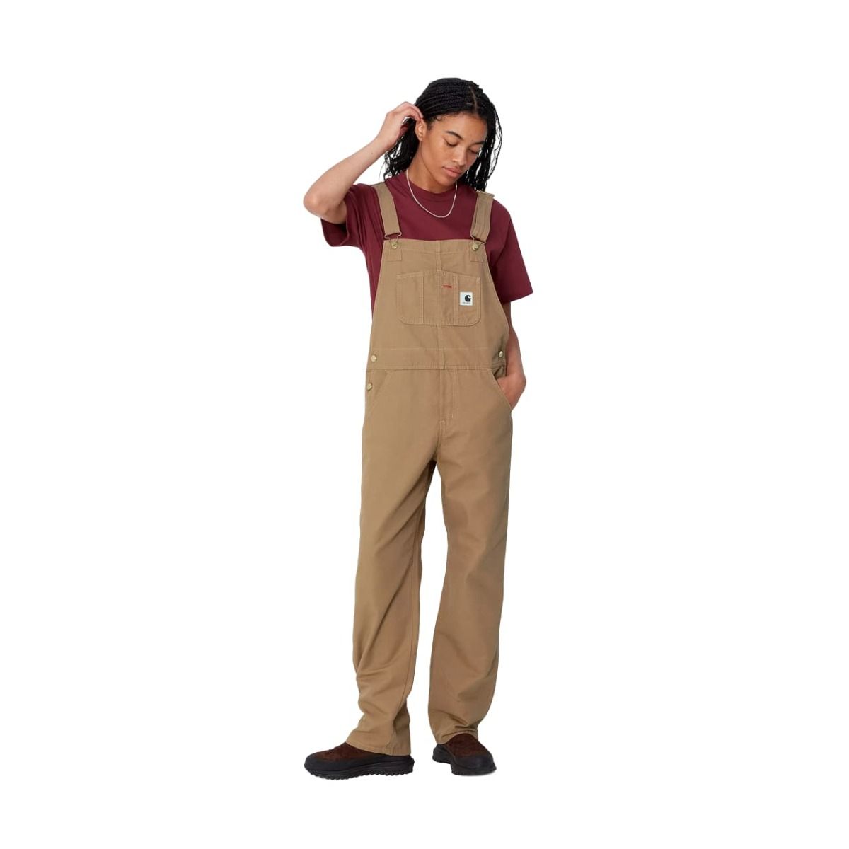 Este peto marrón, inspirado en las prendas de trabajo tradicionales, presenta tejido lavado para un tacto más suave, pernera recta, remaches metálicos, solapa de cierre con botones en la parte delantera, amplios bolsillos laterales, posteriores y en el pecho, tirantes ajustables, puntadas de refuerzo en zonas de mayor tensión, botones personalizados y una etiqueta cuadrada con el logo de Carhartt WIP tejida en el bolsillo frontal.