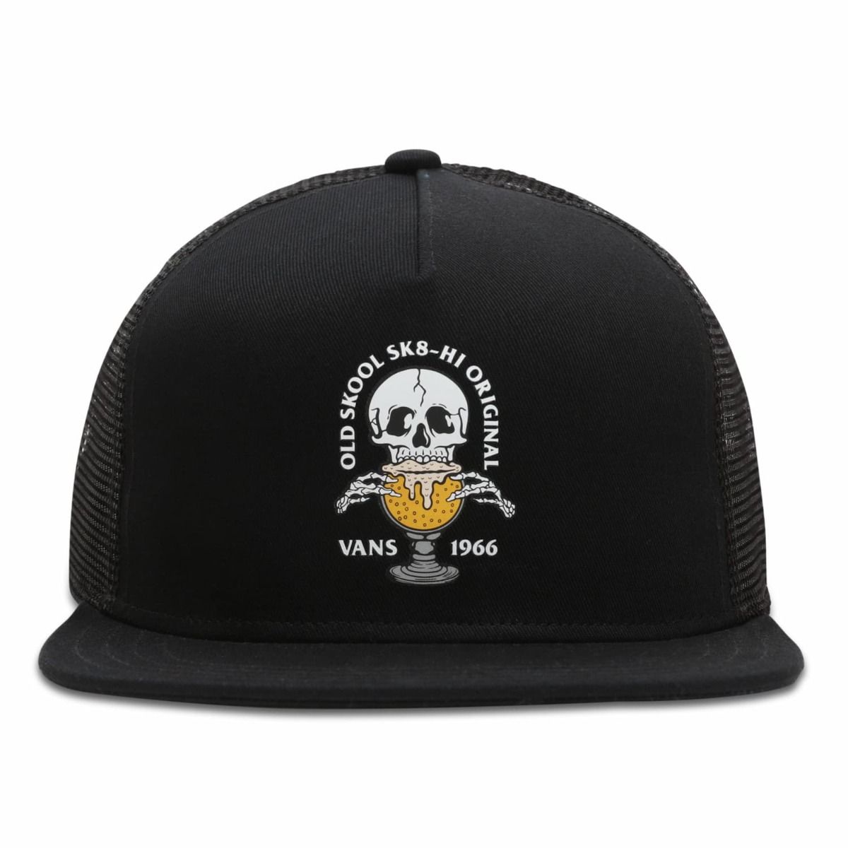 Esta gorra trucker estructurada en 5 paneles cuenta con parte delantera de algodón, parte posterior y forro de poliéster, estampado del logo de la marca y esqueleto en el frente y cierre posterior ajustable de plástico.