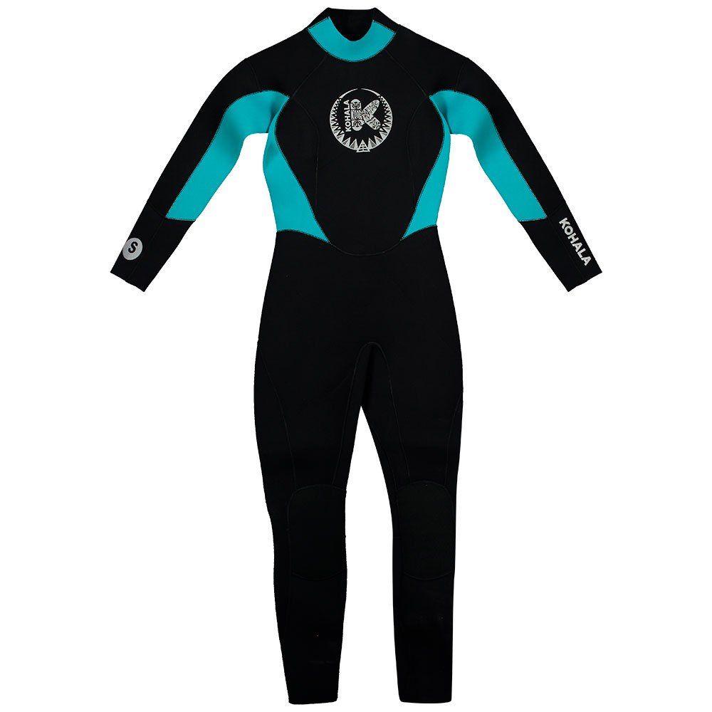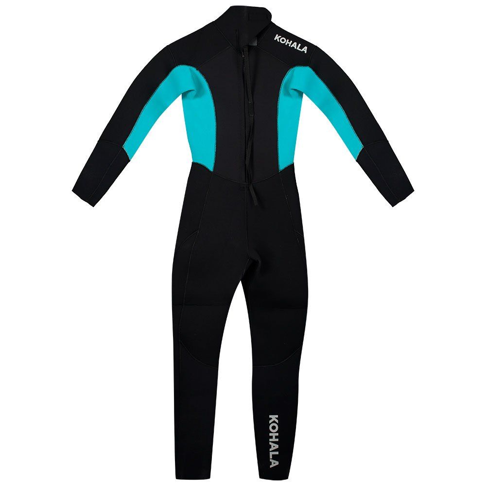 El traje de neopreno para mujer Kohala 4/3mm con cremallera en la espalda negro y azul tiene el logo de Kohala estampado en el pecho.
