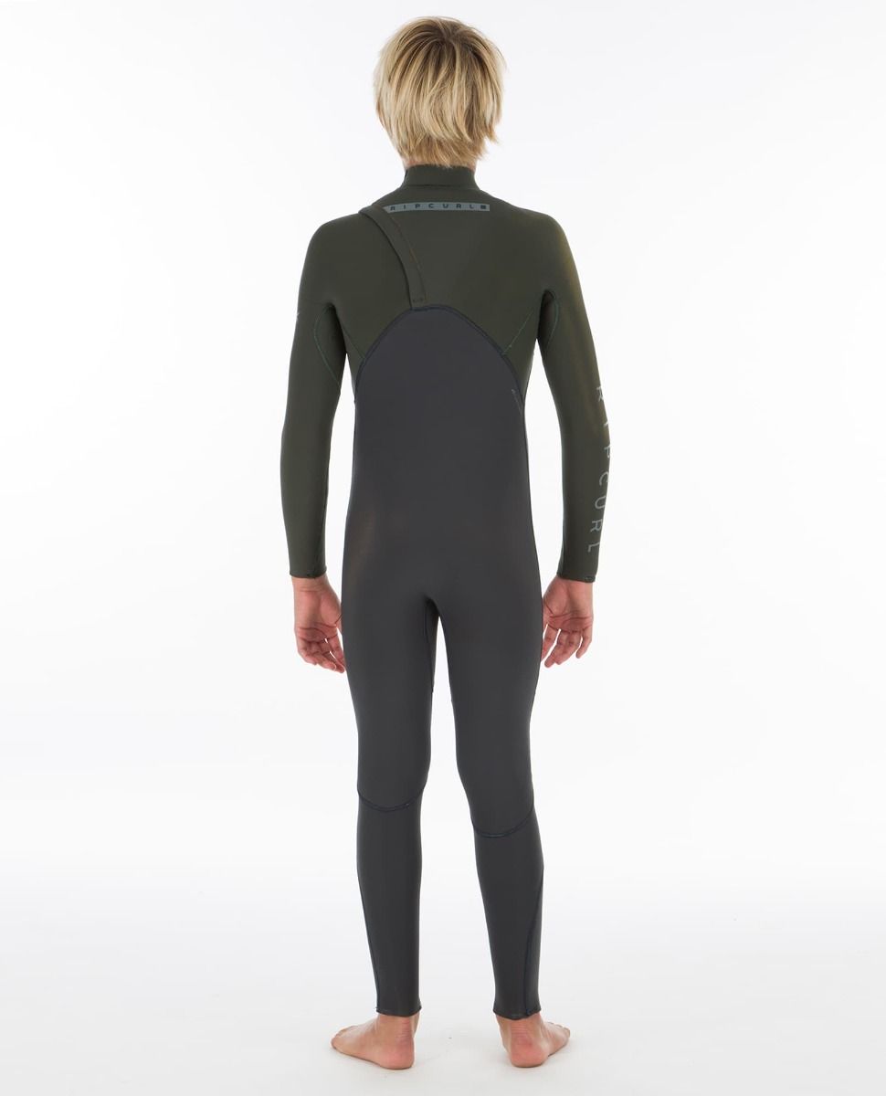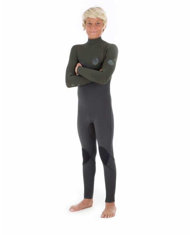 El traje de surf para chico Flashbomb 5/3 Zip Free verde (Khaki) de Rip Curl está fabricado con 100% neopreno ligero y superelástico E5 y forro térmico Flash Lining E5.
