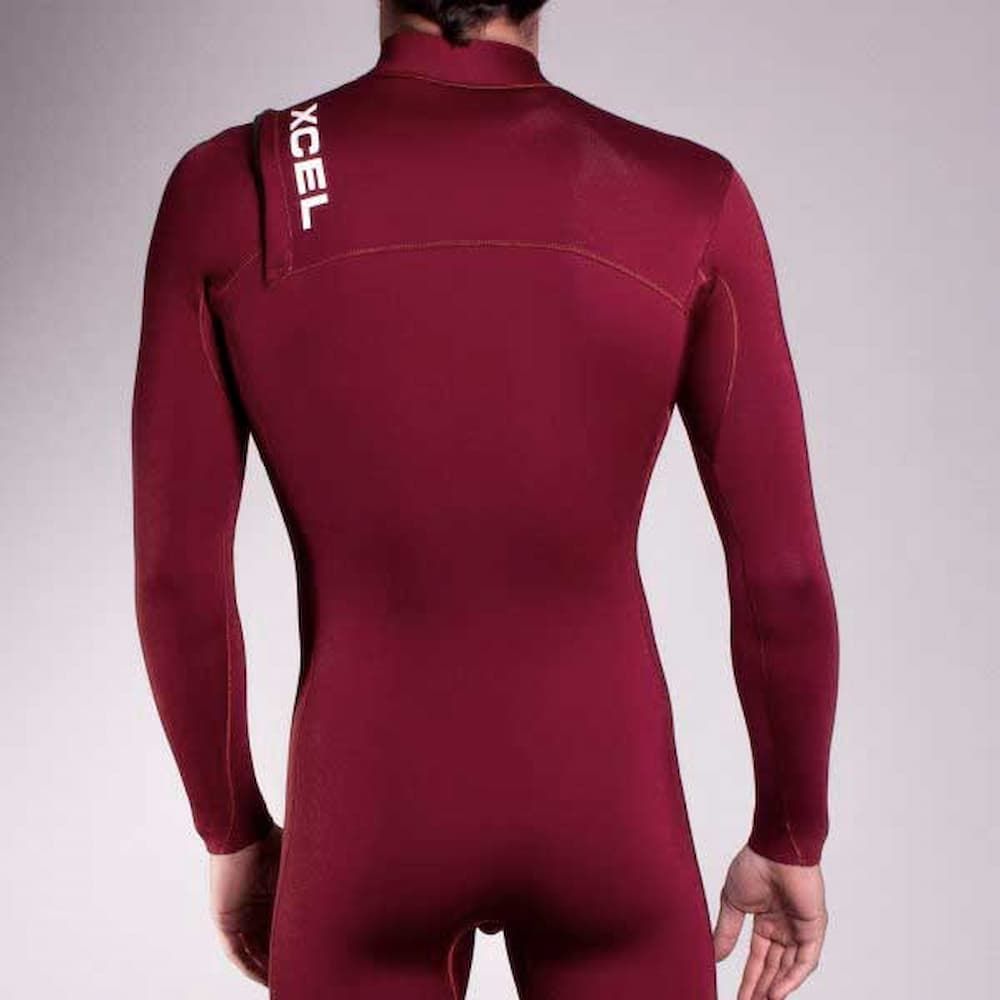 El traje de surf con cremallera en el pecho Comp X2 3/2mm granate para hombre tiene el logo de Xcel estampado en contraste en el pecho, la espalda y las piernas.