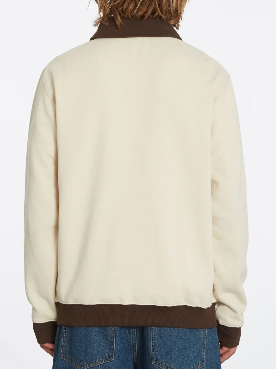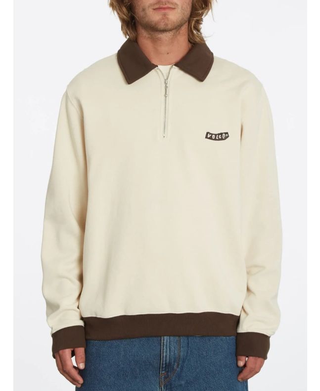 La sudadera con media cremallera para hombre Nevermine Crew de Volcom en tono blanco hueso (Whitecap Grey) ha sido confeccionada con tejido mezcla de algodón (80%) y poliéster (20%) con fibras recicladas Repreve™(290g).