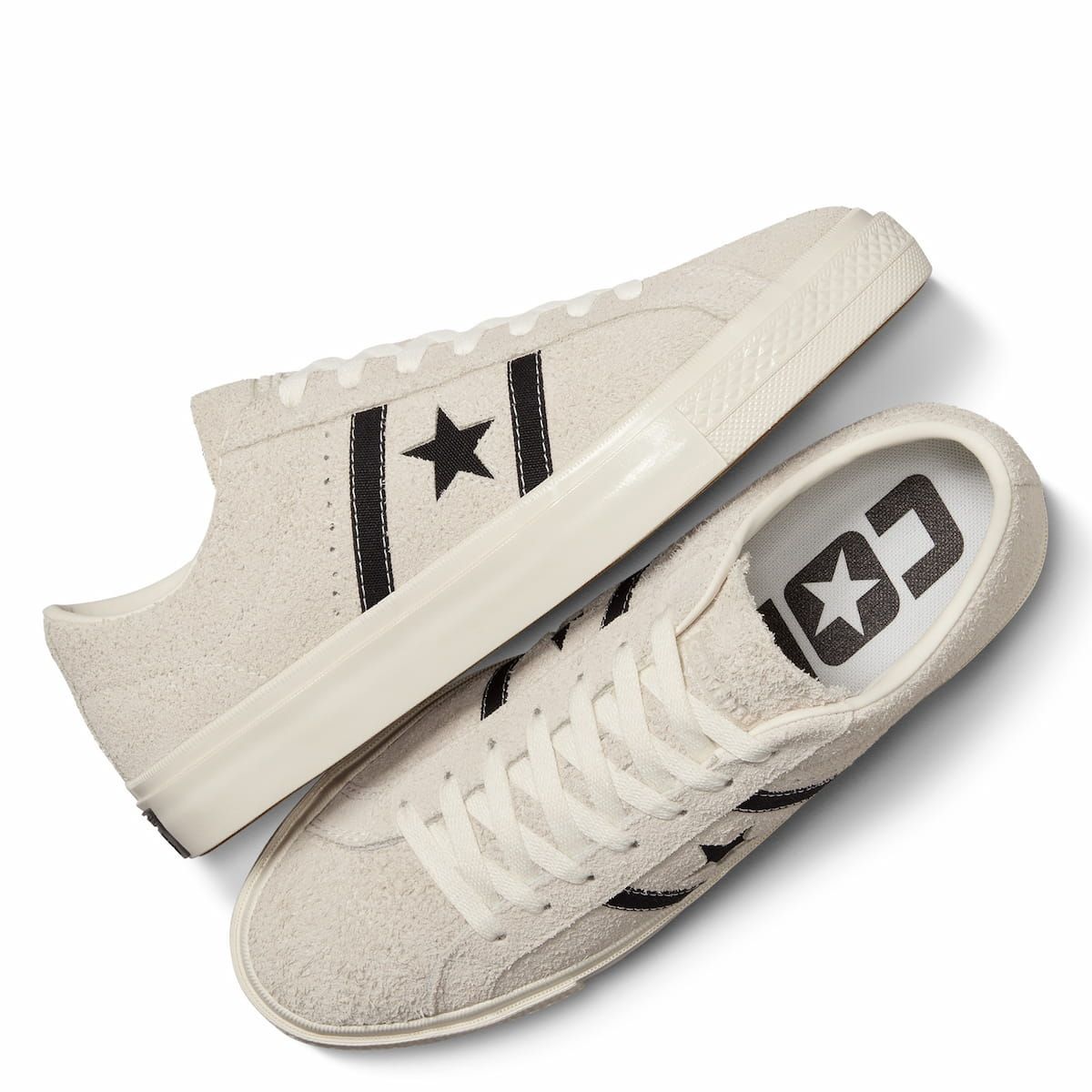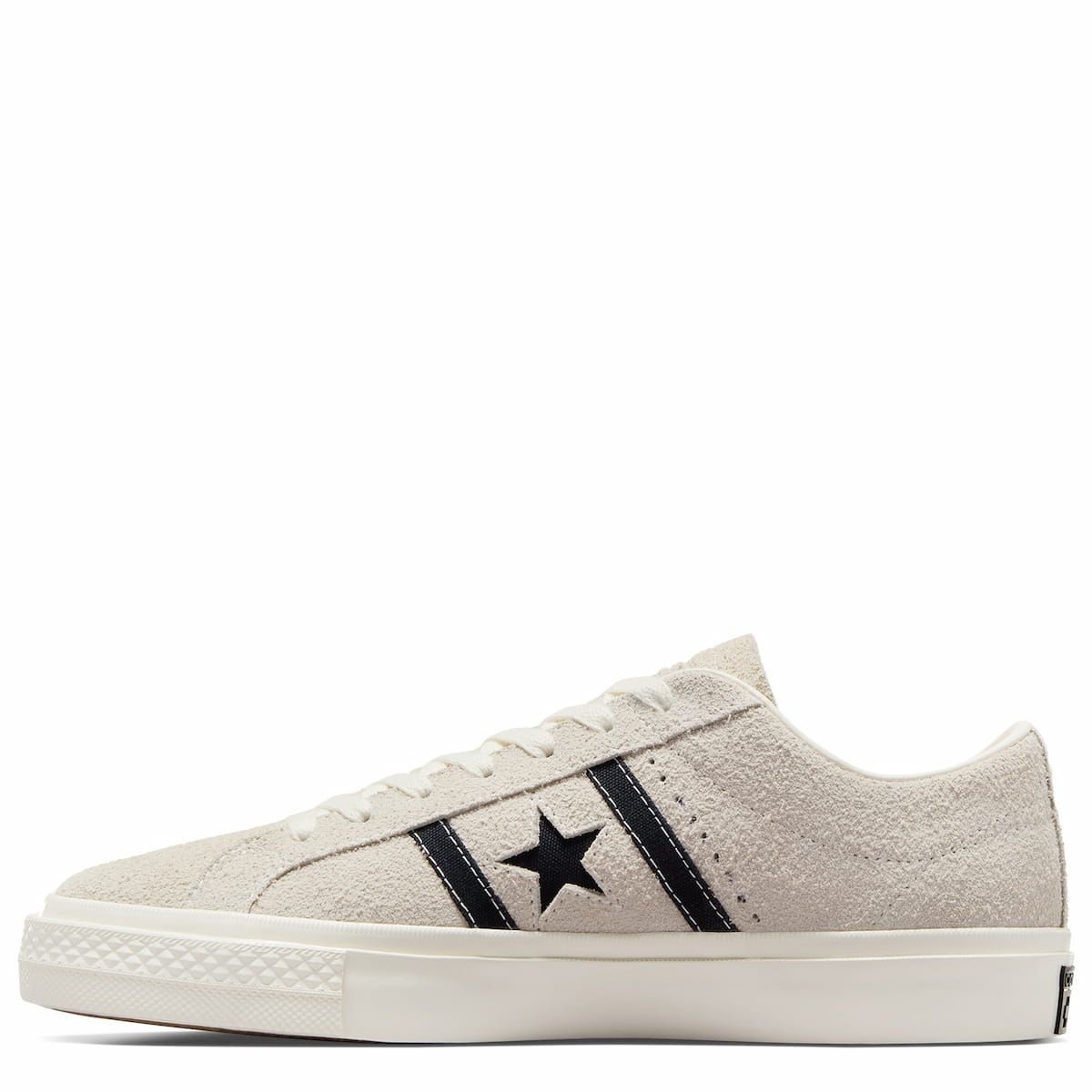 Las Converse CONS One Star Academy Pro Suede Egret-Black-Egret cuentan con un perfil bajo para una flexibilidad máxima, parte superior de ante aterciopelado con refuerzo de goma, lengüeta elástica para que se mantenga en su sitio, plantilla con amortiguación de espuma CX para mayor absorción de impactos, suela de goma de tracción para un agarre óptimo, cordones de algodón resistentes y el logotipo One Star junto con dos rayas en color negro en el lateral.