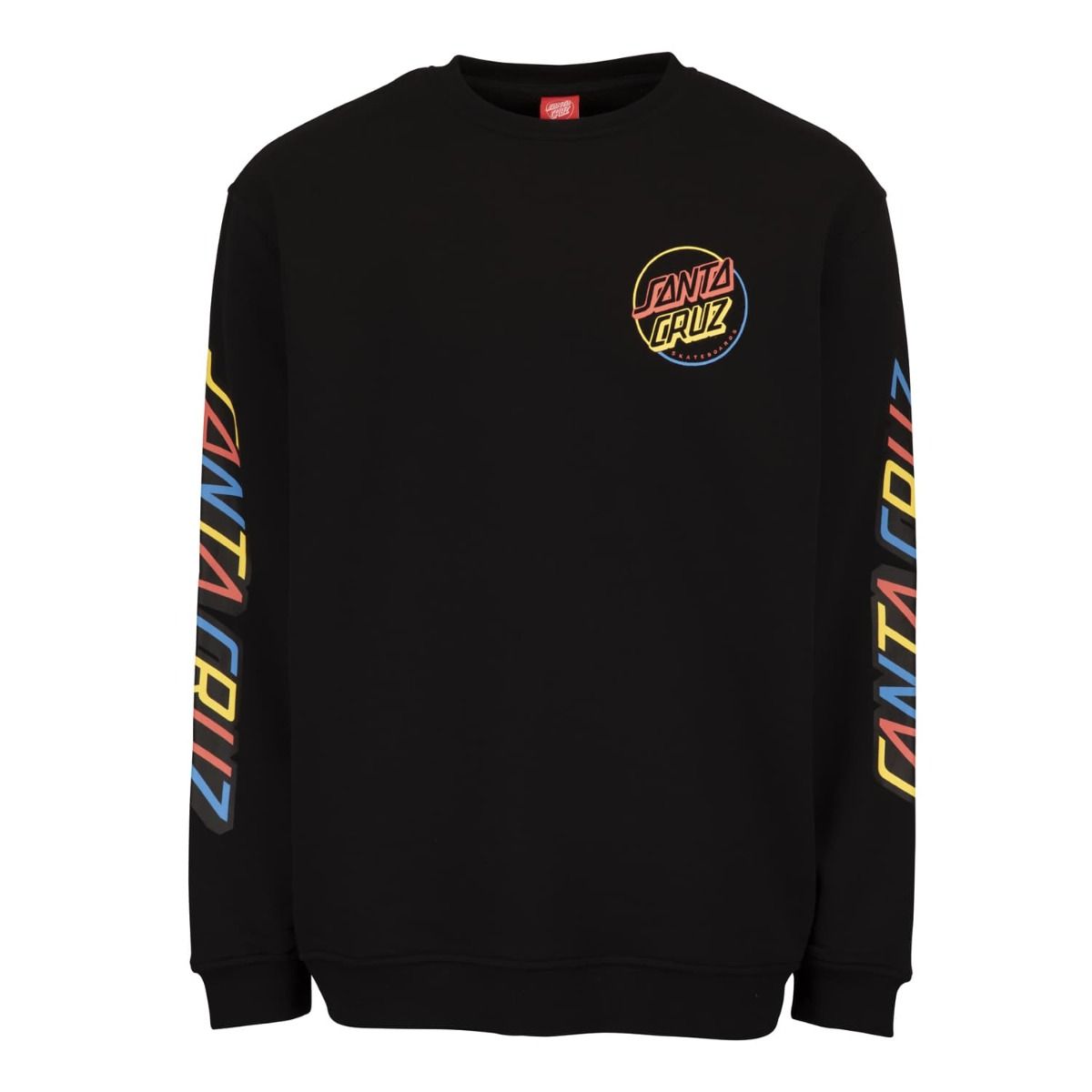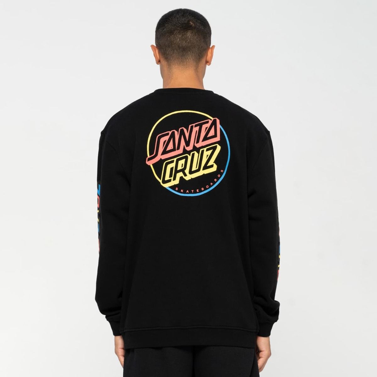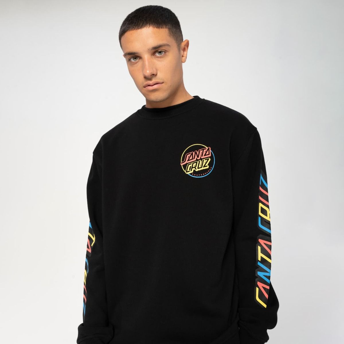 Este crew de ajuste regular cuenta con cuello redondo, punto canalé en puños y parte inferior, forro cepillado de 330gsm y el logo de Santa Cruz Skateboards multicolor estampado en el lado izquierdo del pecho, las mangas y la espalda.