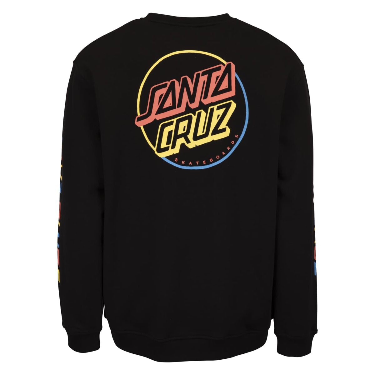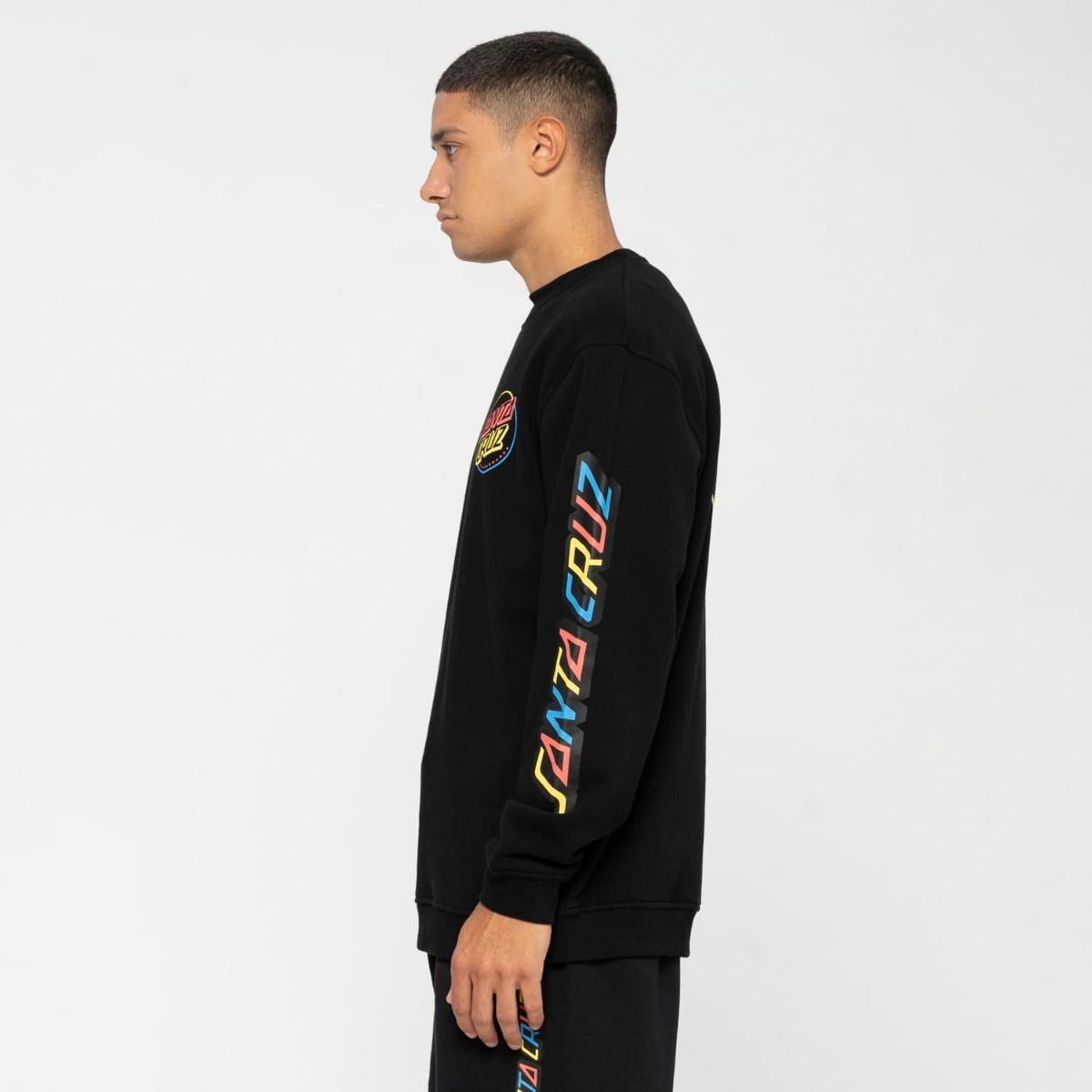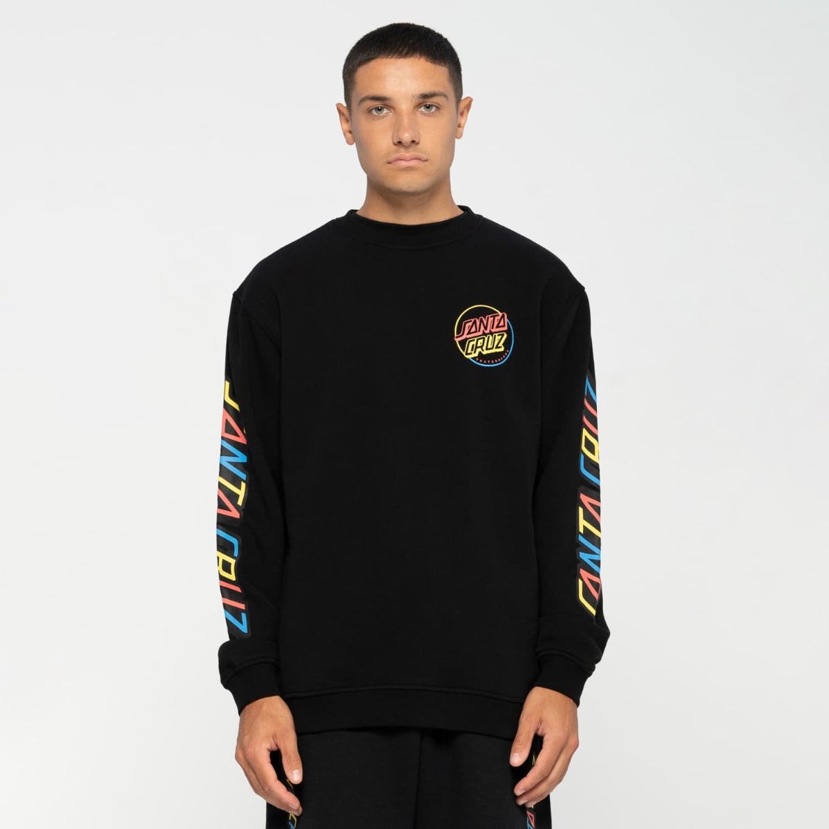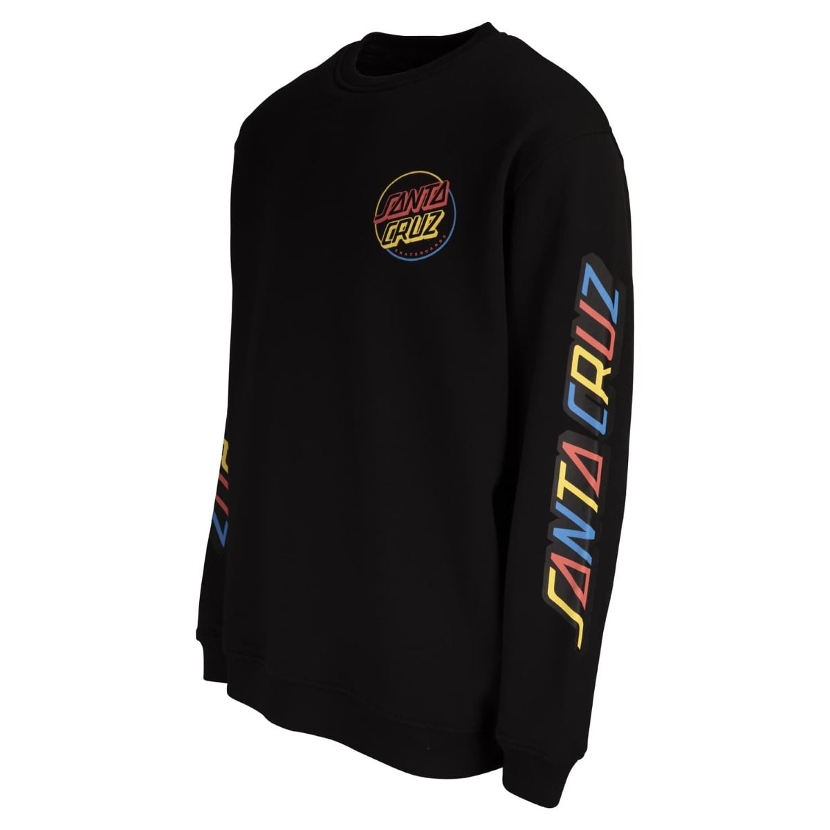 Este crew de ajuste regular cuenta con cuello redondo, punto canalé en puños y parte inferior, forro cepillado de 330gsm y el logo de Santa Cruz Skateboards multicolor estampado en el lado izquierdo del pecho, las mangas y la espalda.