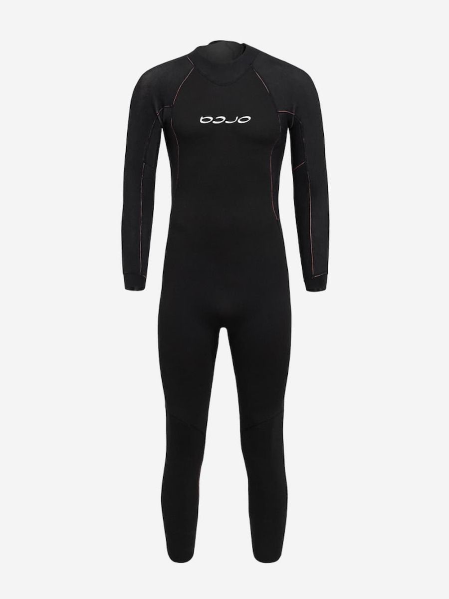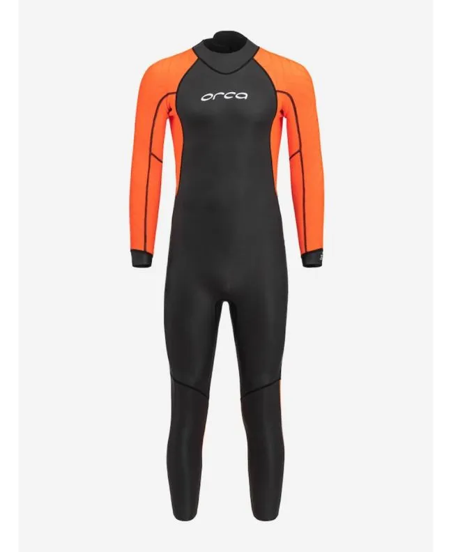 El traje combina un cuerpo en color negro (Black) con paneles en naranja de alta visibilidad en mangas y piernas. El branding ORCA se integra de forma limpia en el pecho y la espalda, con un diseño técnico y funcional claramente orientado al rendimiento.