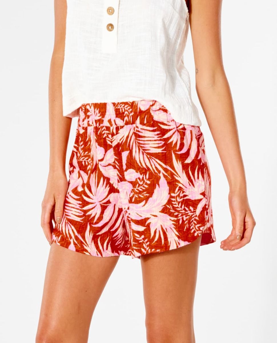Estos shorts veraniegos cuentan con corte corto, cintura elástica, tejido lavado en prenda, estampado tropical en toda la prenda y una discreta etiqueta de metálica de Rip Curl.