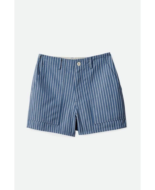Estos shorts workwear de tiro alto cuentan con ajuste estándar, cintura Hollywood sin costuras, cierre de botón, entrepierna de 3", pierna recta, bolsillos de parche delanteros y traseros, estampado a rayas y una discreta etiqueta de Brixton tejida en la costura lateral.