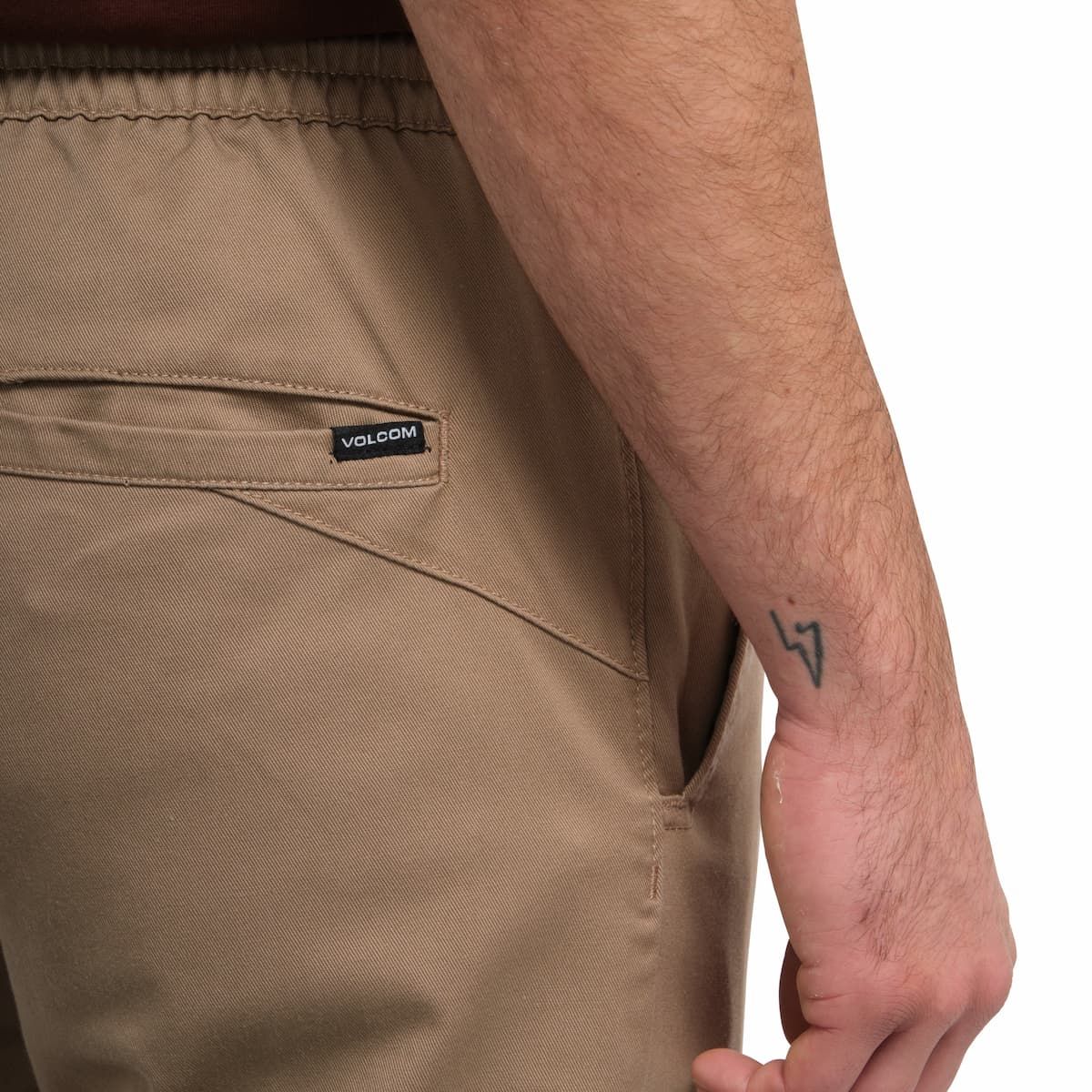 El pantalón de deporte Frickin Slim Tapered Jogger Khaki para hombre tiene una etiqueta de garantía Volcom cosida en la cintura interior.