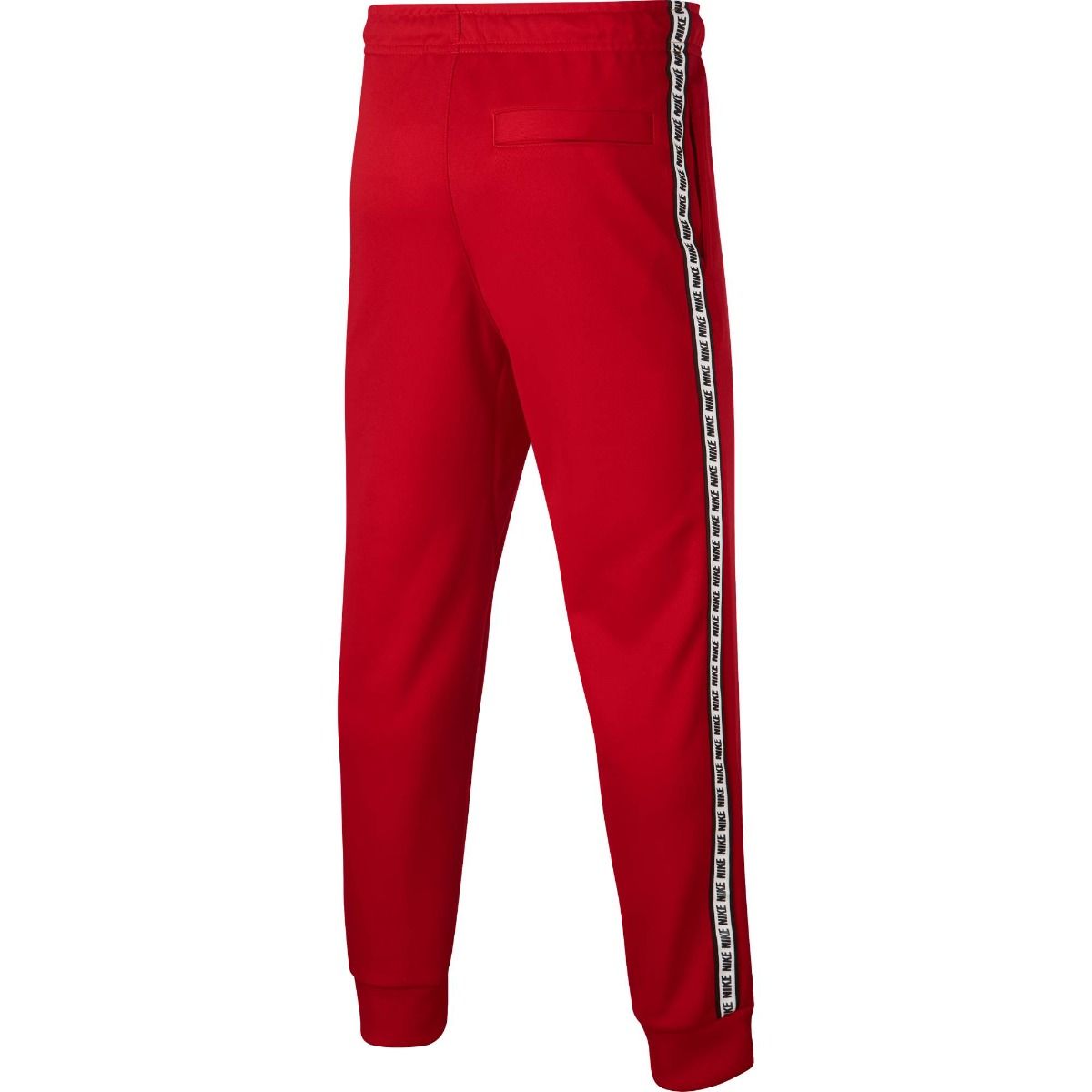 El pantalón Nike Sportswear rojo tiene estampado el logo de la marca en el muslo y en una cinta a lo largo de toda la pierna.