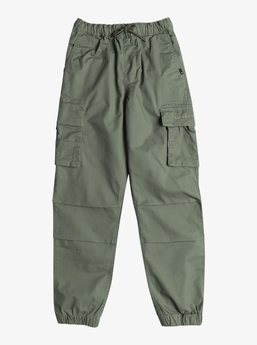Estos pantalones juveniles tipo cargo verdes cuentan con corte recto, cintura y bajos elásticos, cordón de ajuste en la cintura, falsa bragueta, bolsillos delanteros, bolsillos posteriores con solapa de velcro, bolsillos laterales cargo, bordado tonal Quiksilver en el bolsillo lateral derecho y una etiqueta con el logo de Quiksilver tejida en el bolsillo delantero y posterior izquierdos.