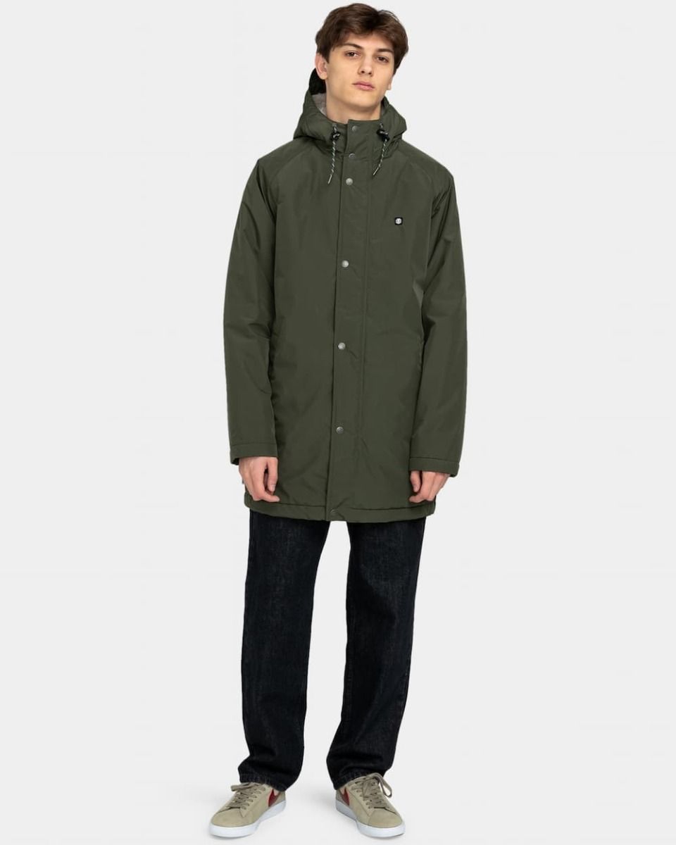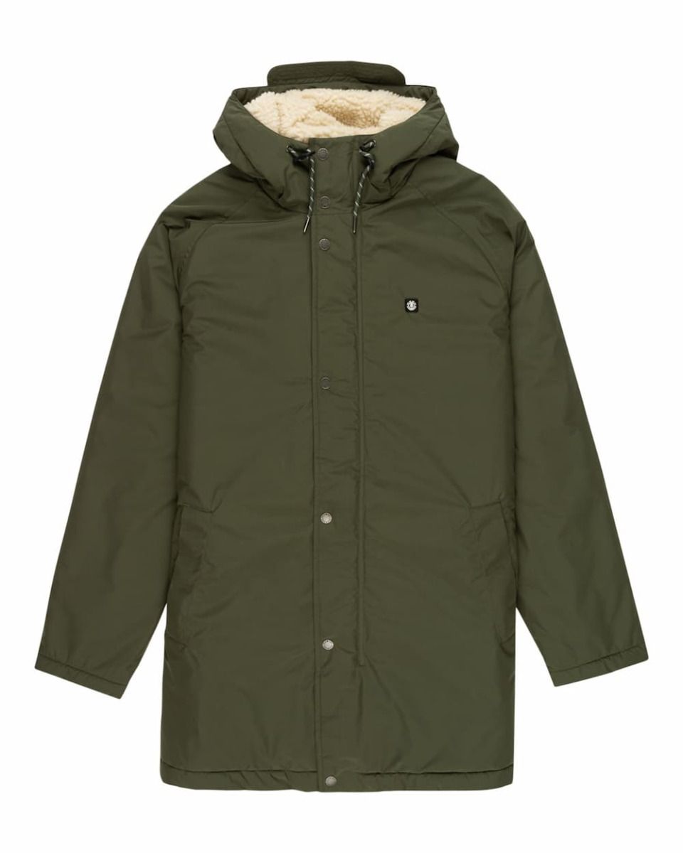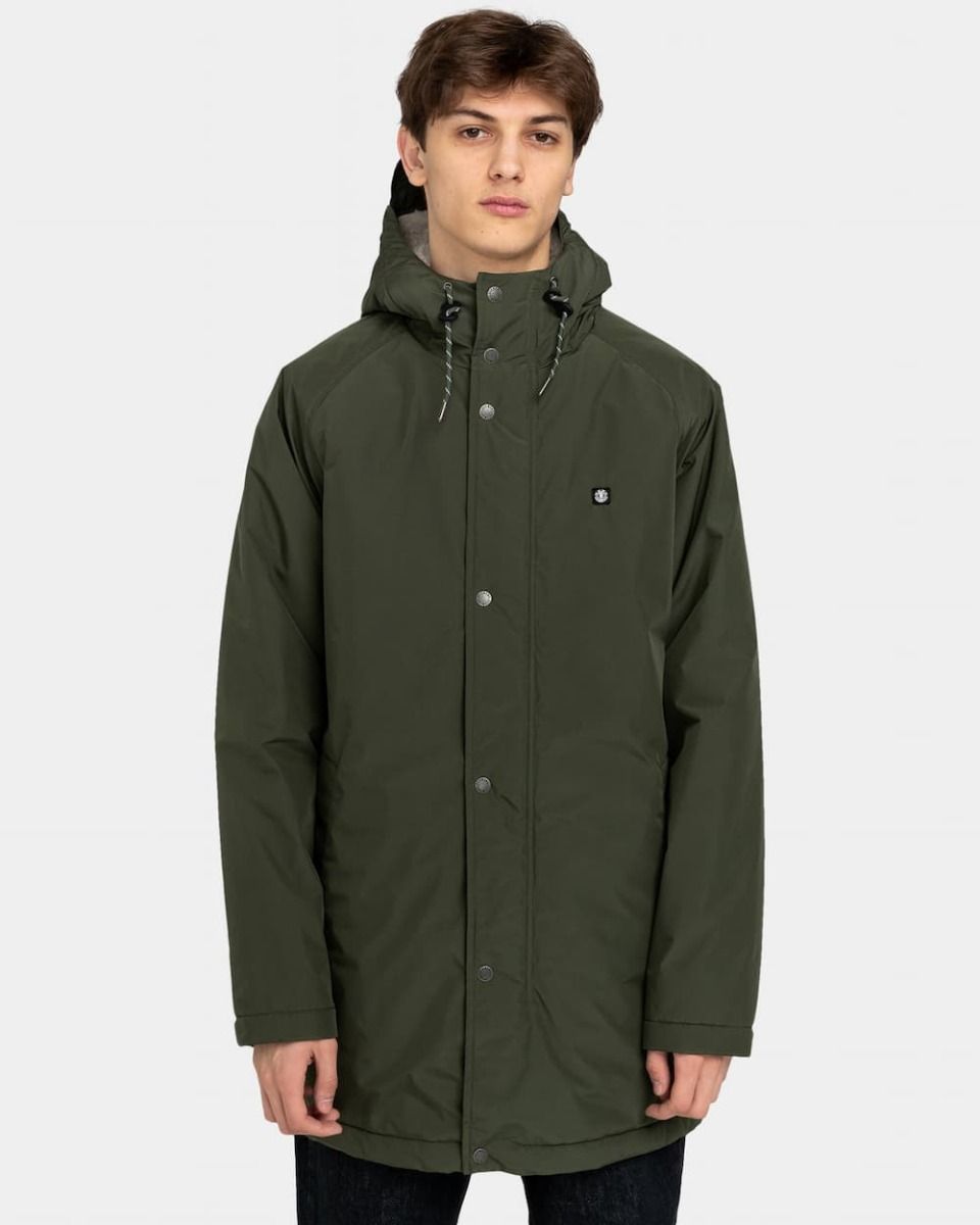 Esta chaqueta larga impermeable color verde de ajuste relajado cuenta con tejido con tratamiento duradero que repele el agua DWR sin PFCs para mantenerte seco y protegido frente a los elementos, cálido forro interior acolchado sherpa, cierre frontal con cremallera, solapa antiviento con cierre de botones a presión, cuello alto, capucha ajustable, dos bolsillos delanteros, un bolsillo interior y un parche con el logo de Element cosido en el lado izquierdo del pecho.