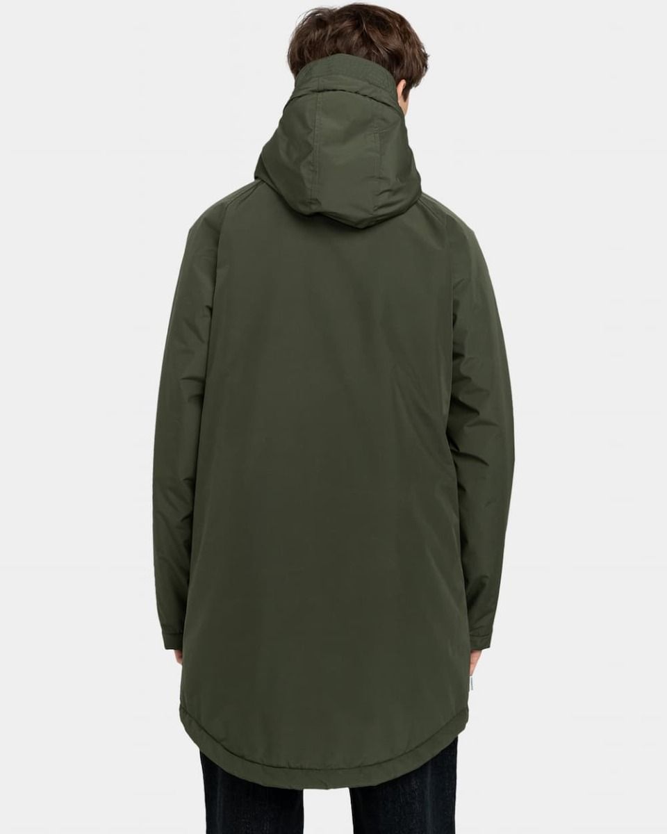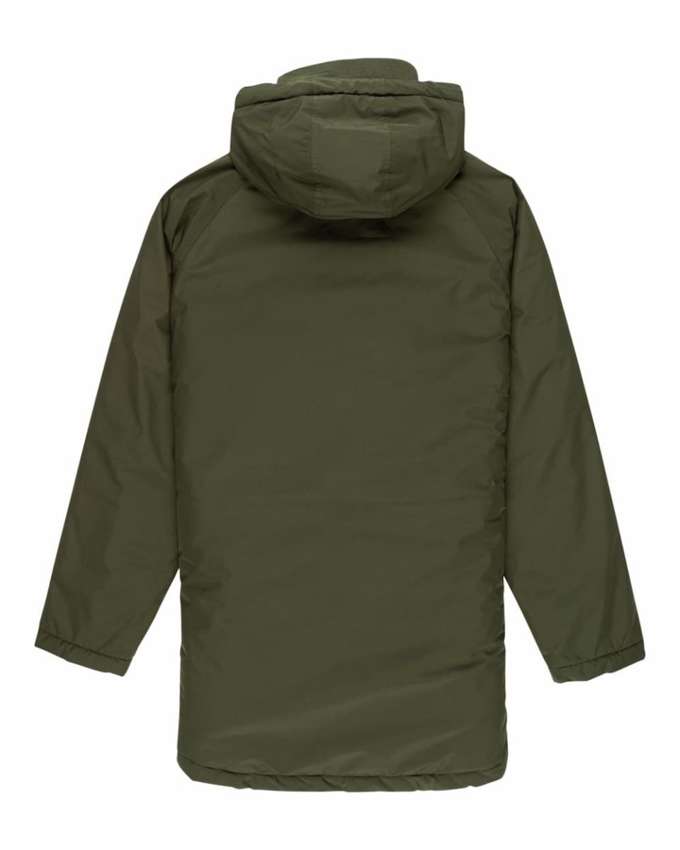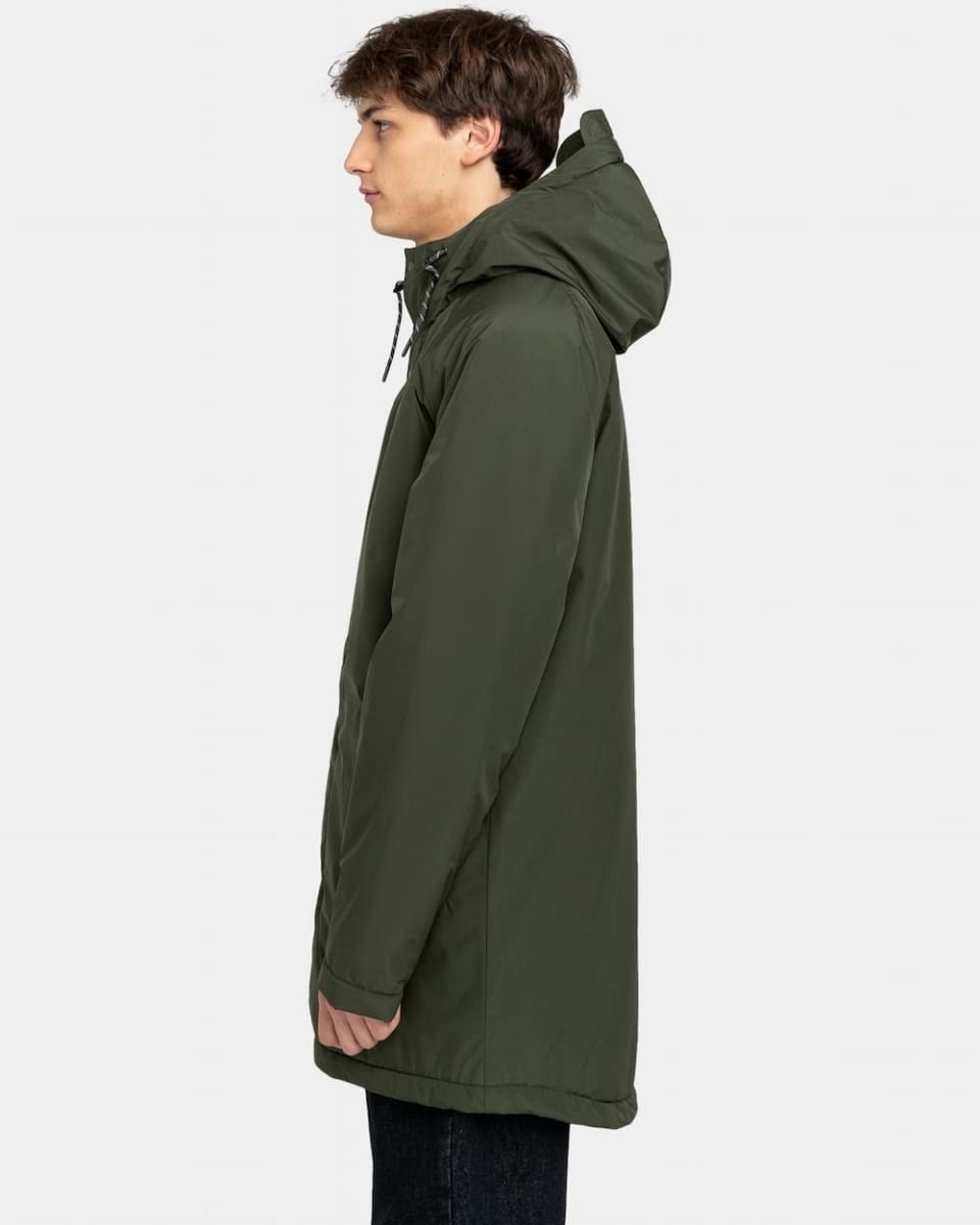 Esta chaqueta larga impermeable color verde de ajuste relajado cuenta con tejido con tratamiento duradero que repele el agua DWR sin PFCs para mantenerte seco y protegido frente a los elementos, cálido forro interior acolchado sherpa, cierre frontal con cremallera, solapa antiviento con cierre de botones a presión, cuello alto, capucha ajustable, dos bolsillos delanteros, un bolsillo interior y un parche con el logo de Element cosido en el lado izquierdo del pecho.
