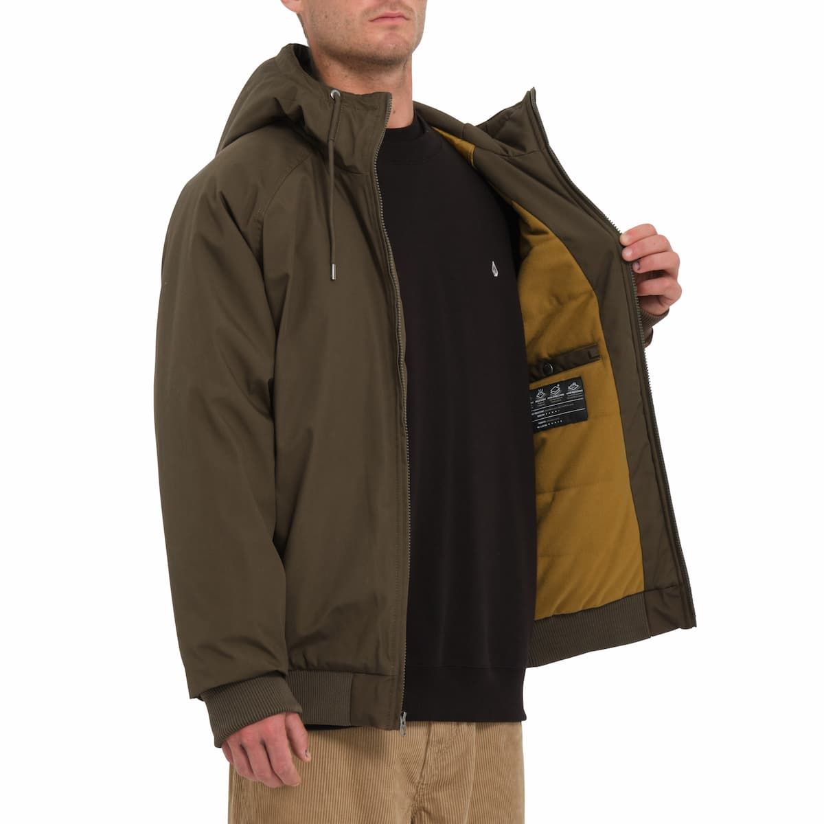 La chaqueta impermeable Hernan 5K Jacket Wren para hombre tiene una etiqueta de garantía Volcom en el interior.