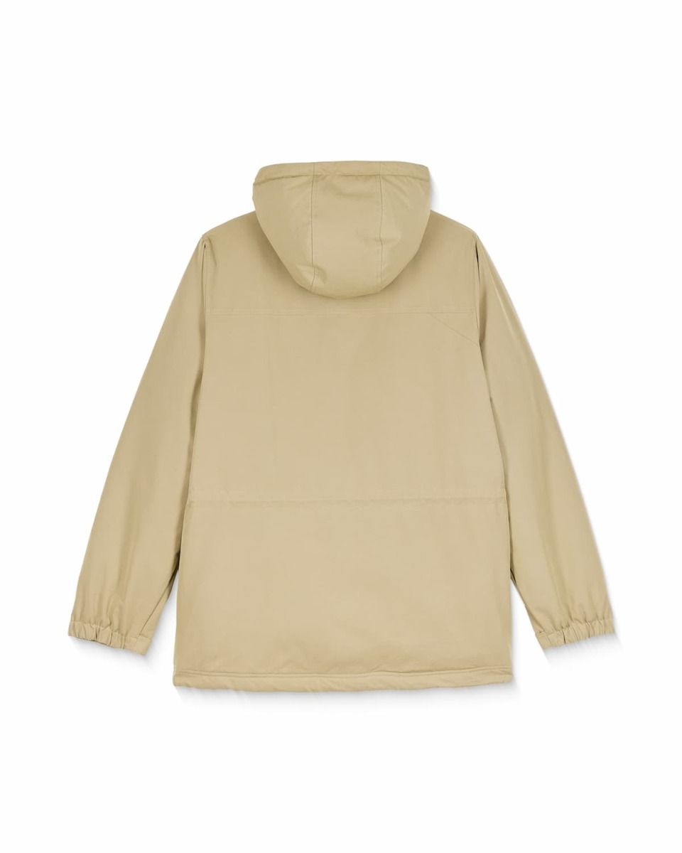Capucha ajustable y cuello alto.