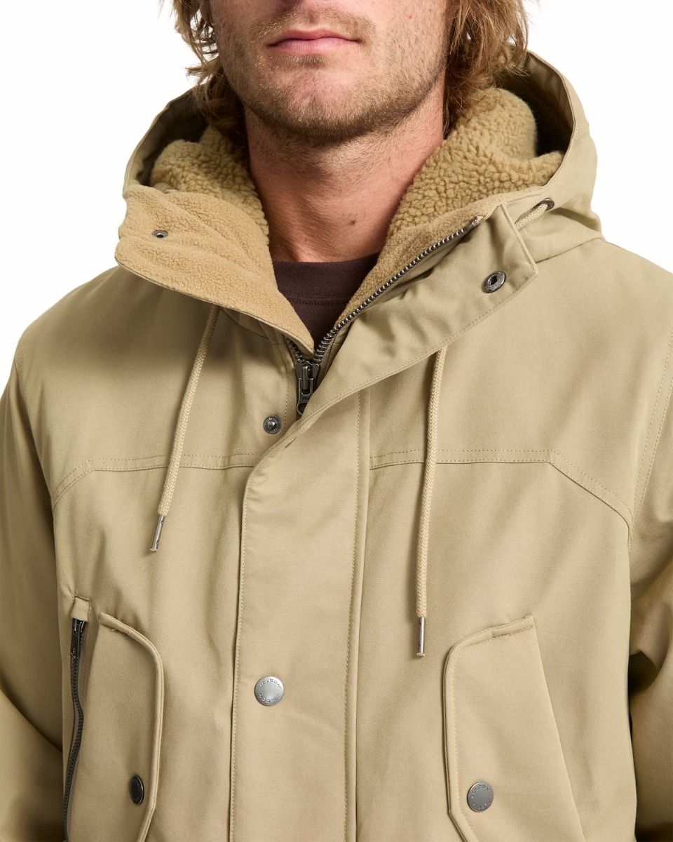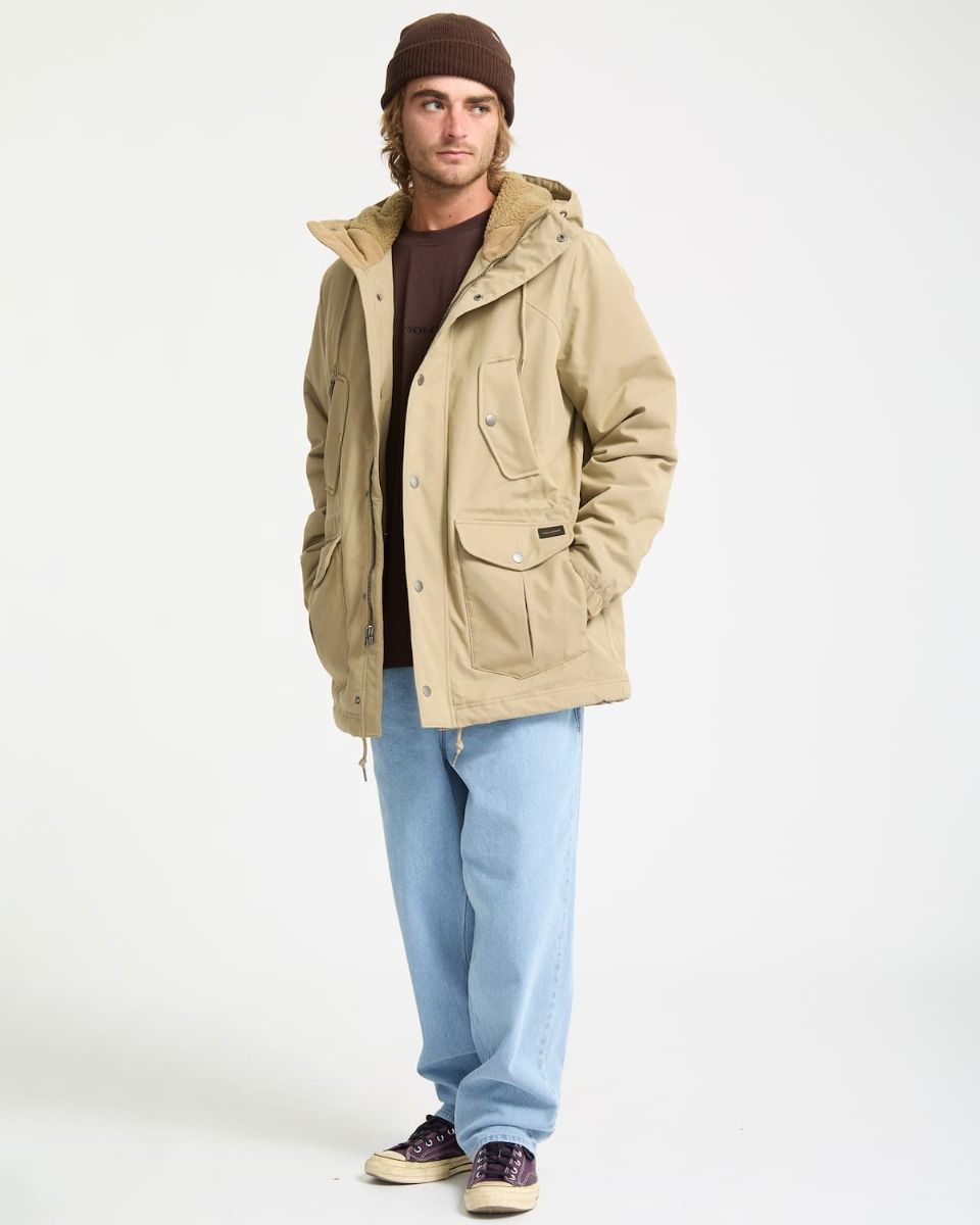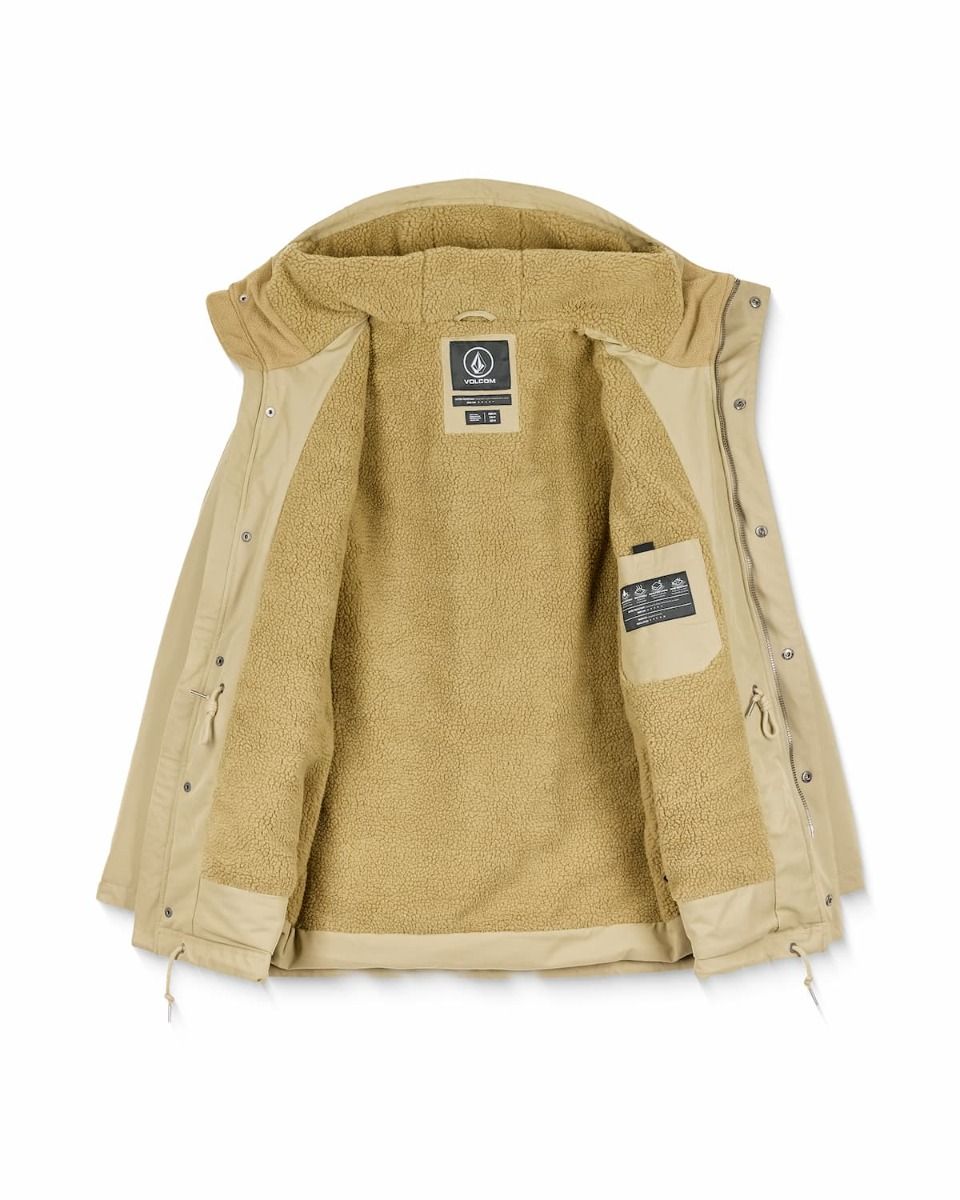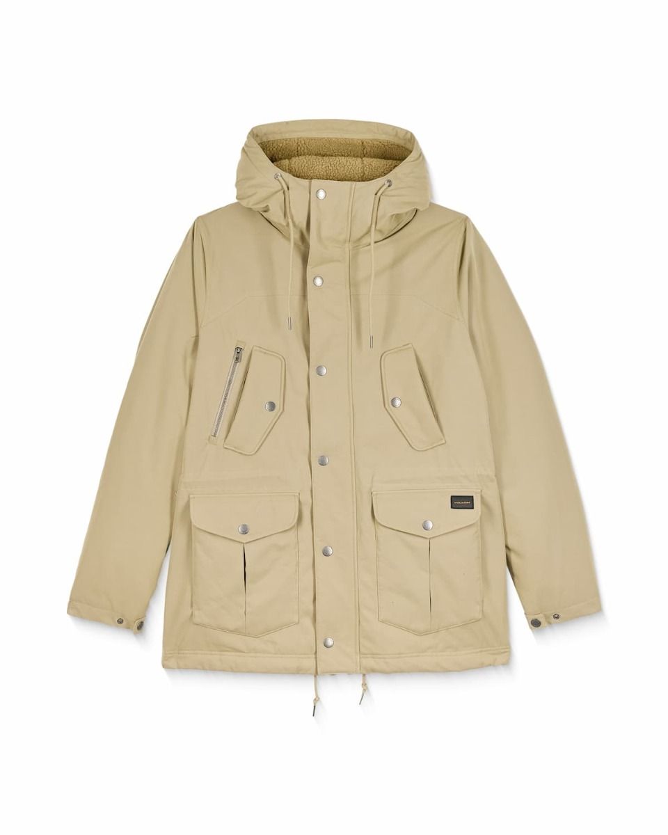 Parka impermeable Volcom Starget 5K para hombre en color caqui con forro de borreguillo y múltiples bolsillos funcionales.