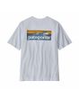 Esta camiseta blanca sostenible de estilo clásico viene con cuello redondo acanalado, manga corta, bolsillo en el pecho, costuras selladas en los hombros, dobladillo recto, el gráfico Boardshort Logo de Patagonia serigrafiado en la espalda y el logo de la marca impreso en color azul en el bolsillo.