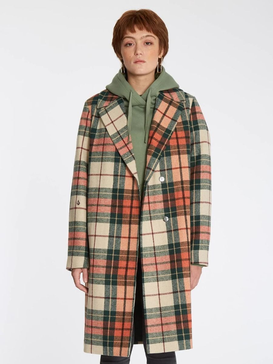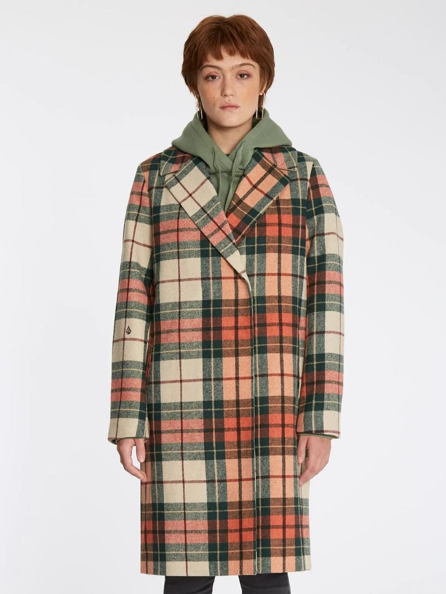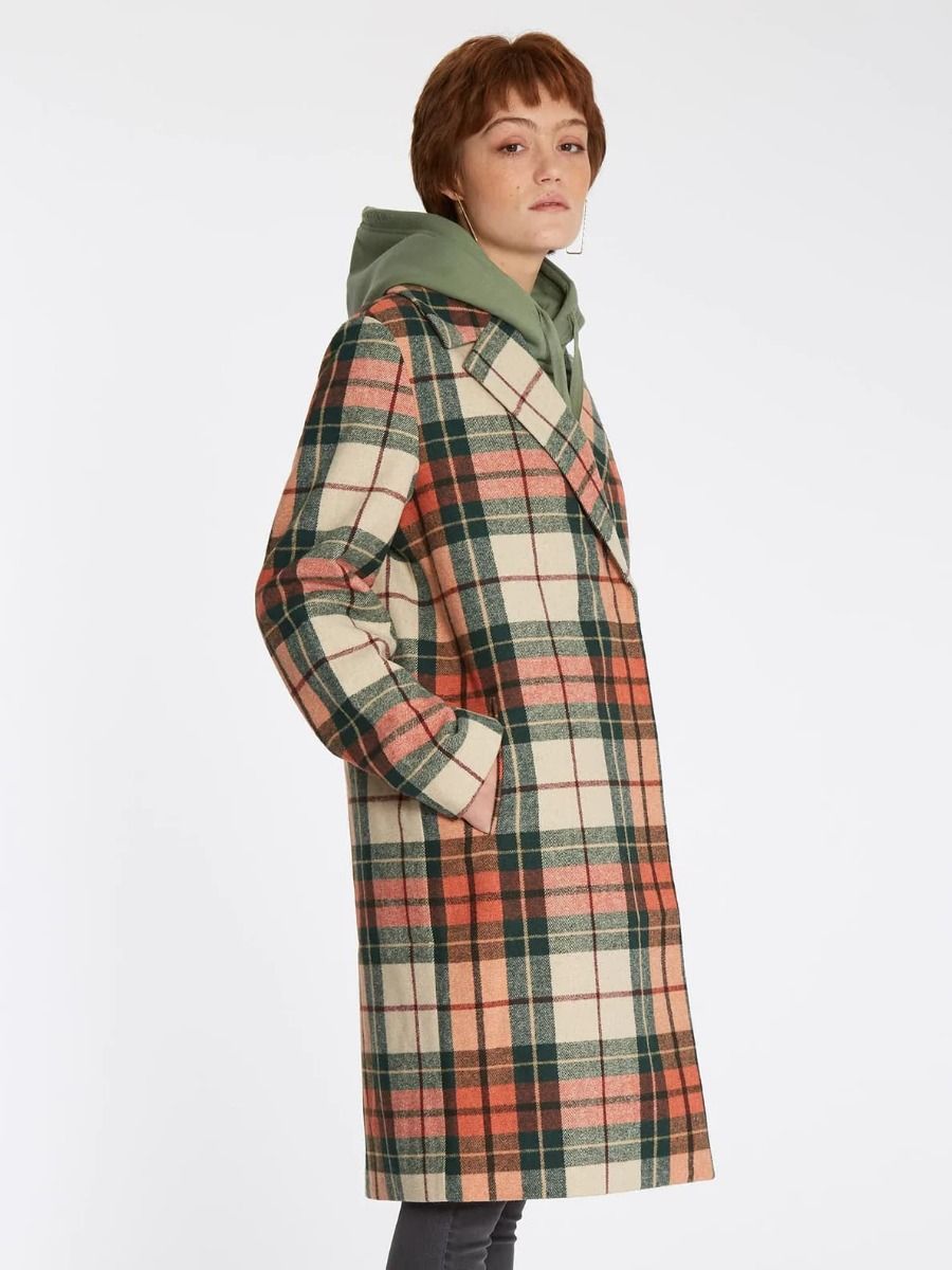 El abrigo para mujer Playedcoat de Volcom en tono teja con estampado a cuadros (Terra Cotta) está confeccionado con tejido mezcla de poliéster (82%), lana (14%), acrílico (3%) y nailon (1%).
