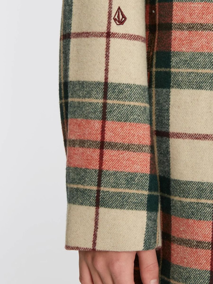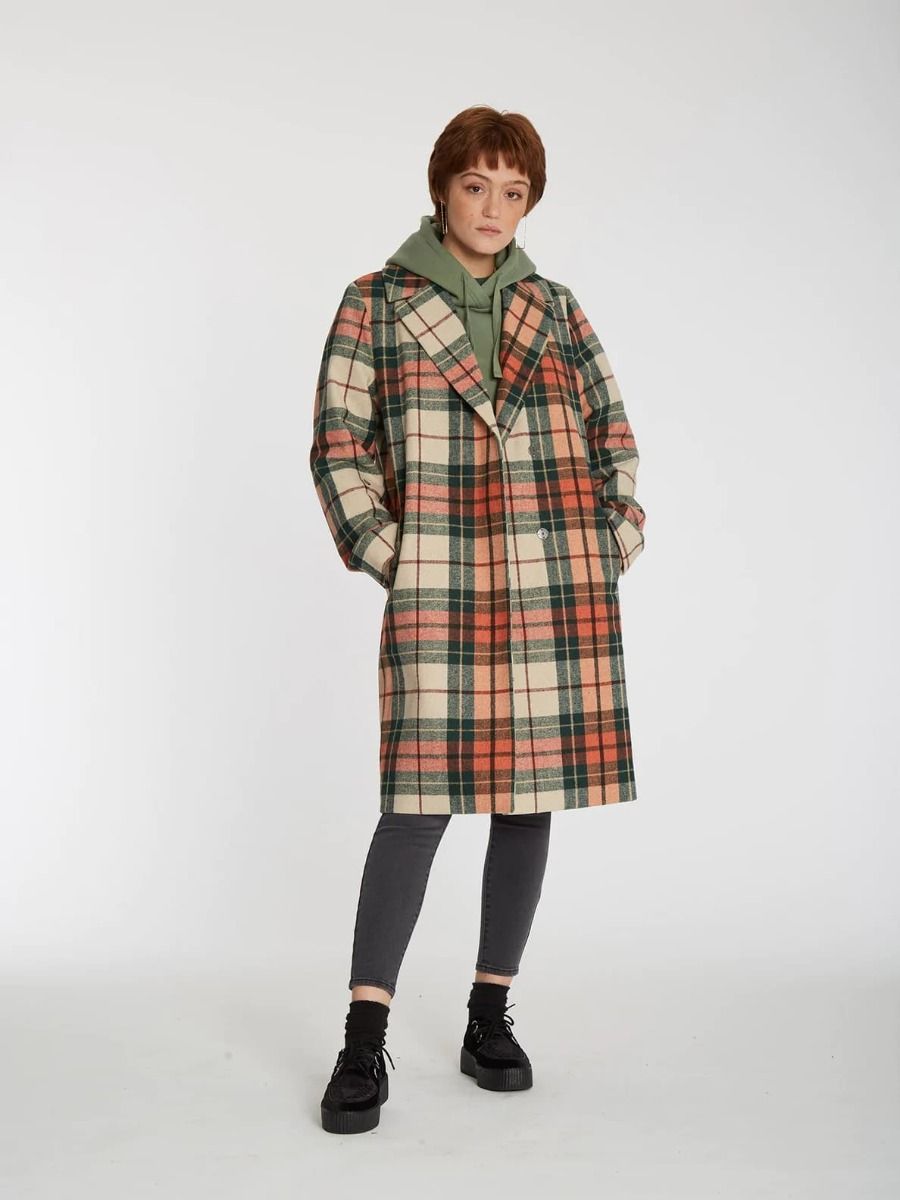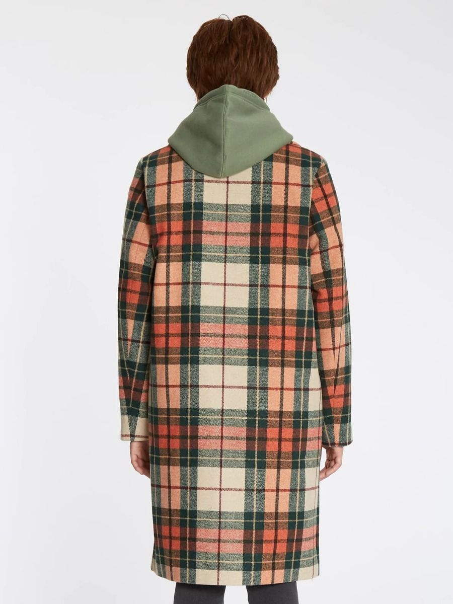 El abrigo para mujer Playedcoat de Volcom en tono teja con estampado a cuadros (Terra Cotta) está confeccionado con tejido mezcla de poliéster (82%), lana (14%), acrílico (3%) y nailon (1%).
