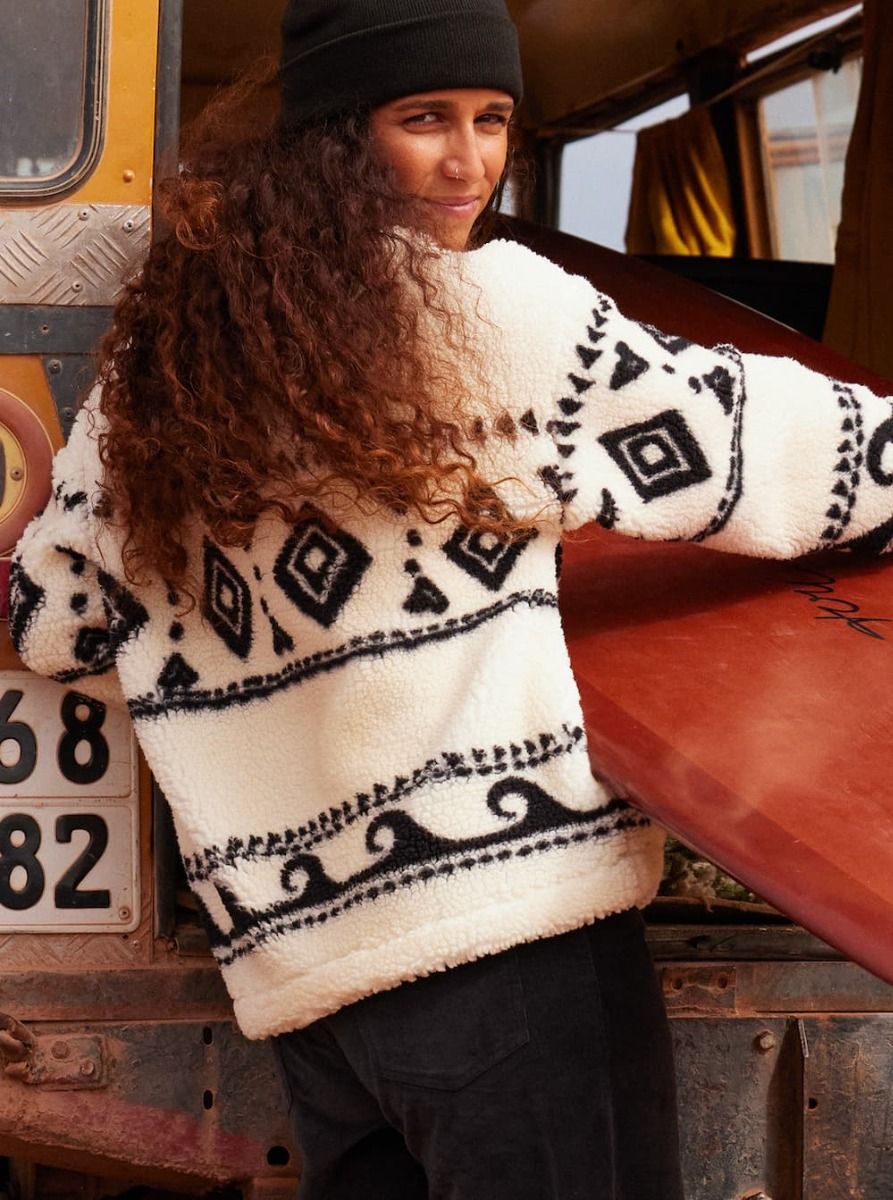 - Tejido sherpa con detalles impresos por toda la prenda.